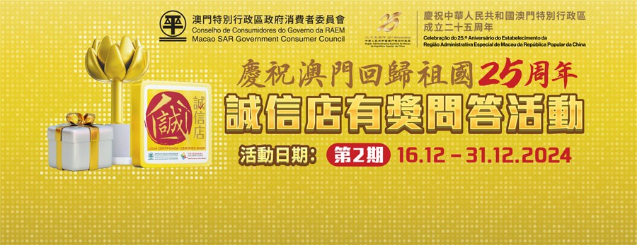 Em comemoração do 25.º Aniversário do Regresso de Macau à Pátria, o Conselho de Consumidores (CC) lançou a 2.ª fase da actividade de perguntas e respostas com prémios sobre Loja Certificada, com vista a promover o símbolo de qualidade “Loja Certificada” junto dos residentes de Macau e turistas, assim como criar em Macau uma imagem de consumo com honestidade e qualidade. Tendo termo hoje a 2.ª fase da actividade, convém aos interessados aproveitar o tempo para participar.