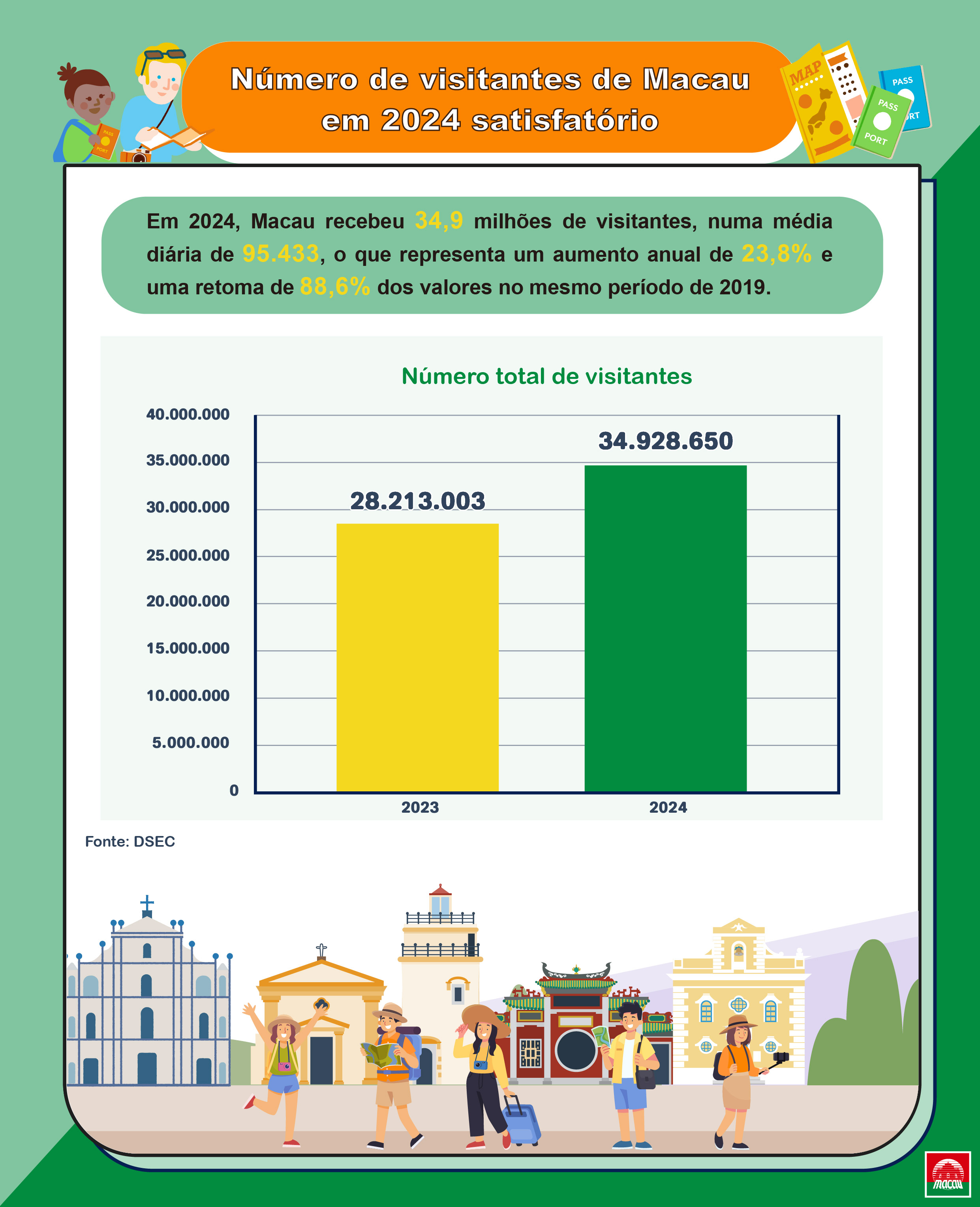 Aproveitando as vantagens próprias, conjugadas com as medidas de apoio a Macau lançadas pelo Governo Central no ano passado e os esforços conjuntos de toda a sociedade, o desenvolvimento da indústria turística de Macau tem vindo a registar uma tendência positiva. Macau registou mais de 34,9 milhões de visitantes (34.928.650) em 2024, um aumento anual de 23,8%, tendo o número de visitantes retomando 88,6% dos valores de 2019, antes da pandemia. O número de visitantes internacionais aumentou 66,0%, atingindo 2,42 milhões (2.423.093), recuperando para 79% dos níveis de 2019.