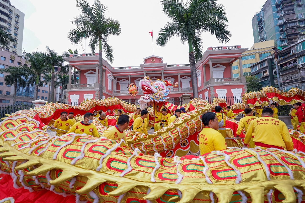 Dança do leão e dragão nos primeiro e segundo dias do Ano Novo Lunar e oferta de felicitações em Coloane, Taipa e Macau