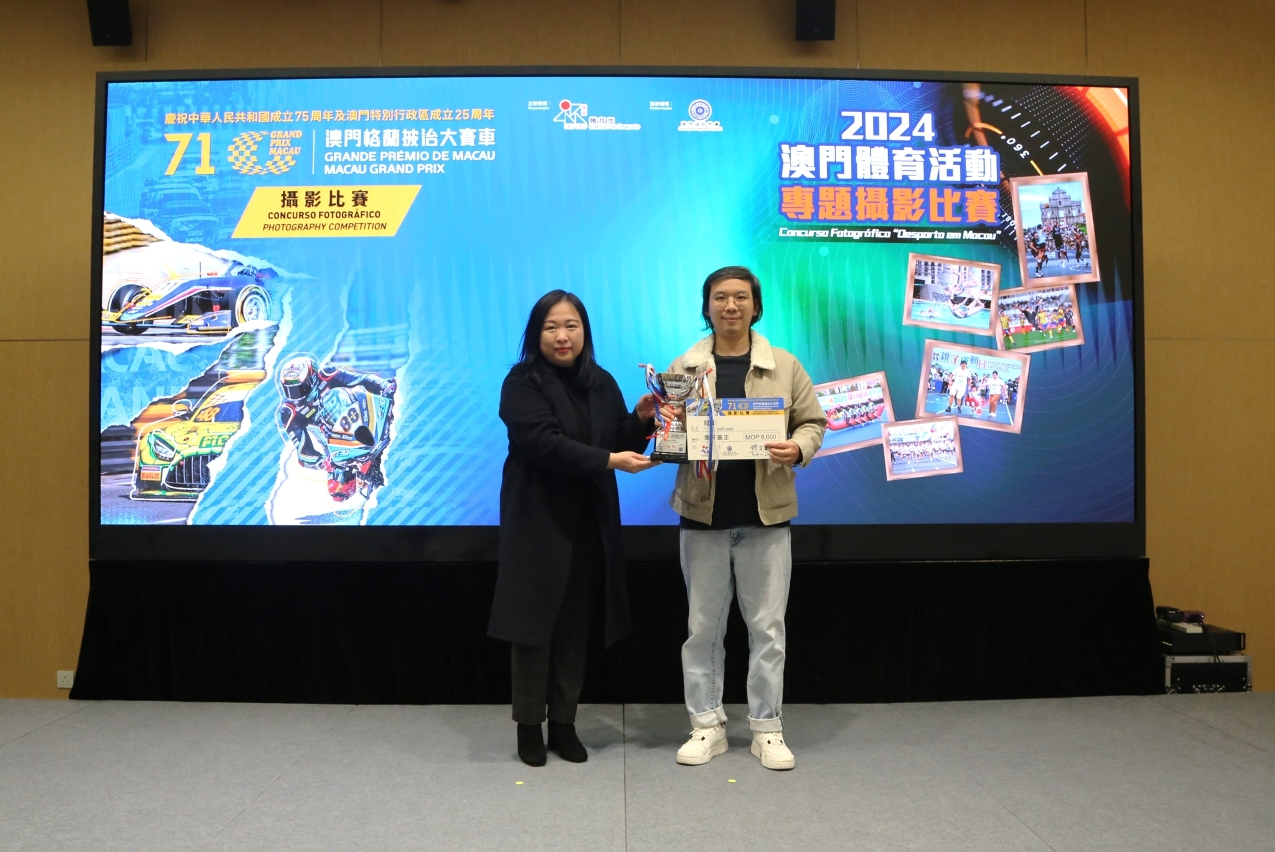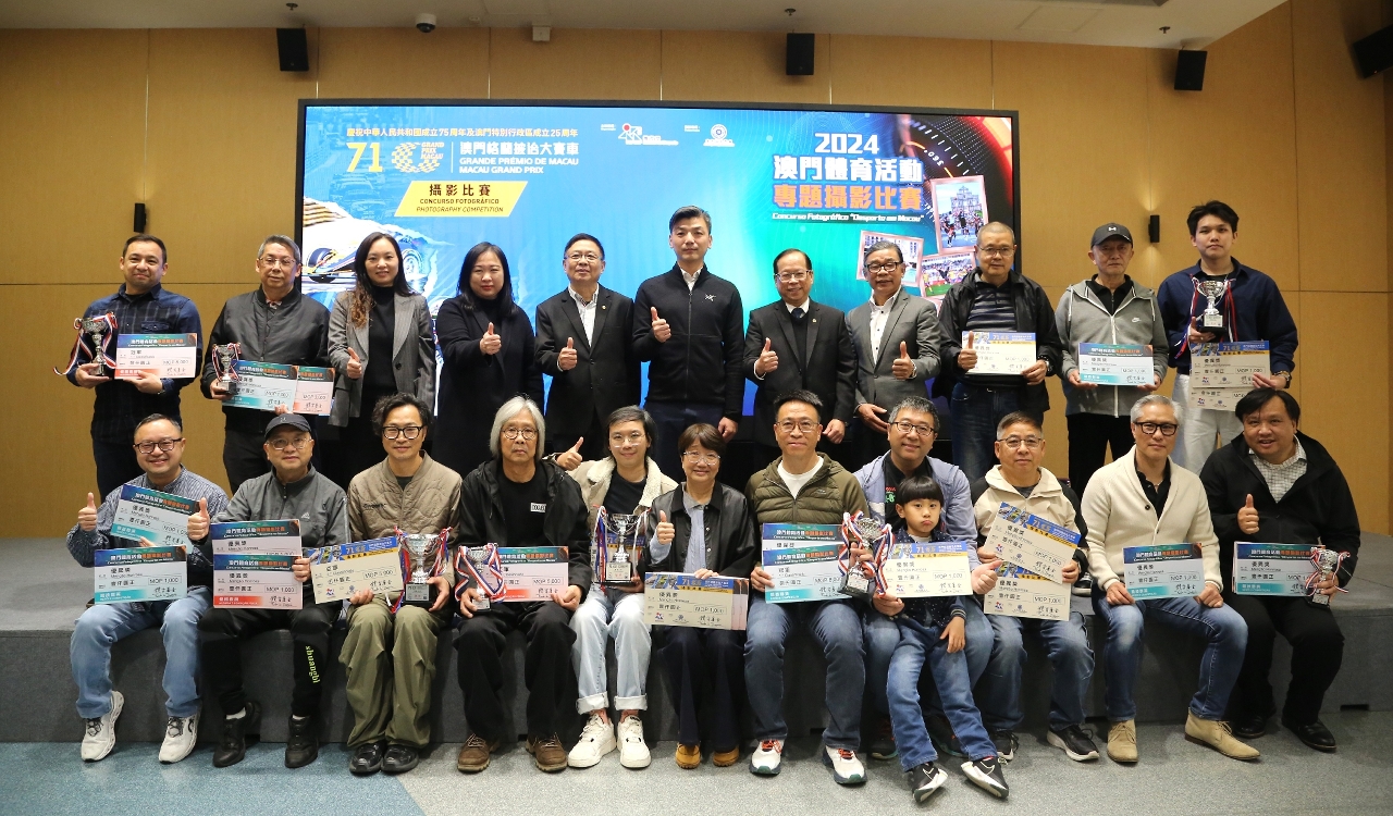 Organizado pelo Instituto do Desporto e com a colaboração da Associação Fotográfica de Macau, realizaram-se com sucesso os Concursos Fotográficos “Desporto em Macau” 2024 e “71.º Grande Prémio de Macau”. A cerimónia da entrega de prémios teve lugar, hoje (dia 21), pelas 18h30, na sala de reuniões deste Instituto, na qual estiveram presentes:o Presidente do Instituto do Desporto, Luís Gomes, a Vice-Presidente, substituta, do Instituto do Desporto, Lei Si Leng, a Chefe do Departamento, substituta, do Instituto do Desporto, Lou I Wan, o Vice-Presidente da Assembleia Geral da Associação Fotográfica de Macau, Ma Chi Son, o Presidente da Direcção da Associação Fotográfica de Macau, Wong Meng Fai e o Vice-Presidente da Direcção da Associação Fotográfica de Macau, Leong Im Kai.