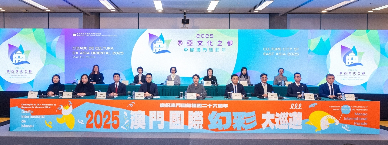 Realizou-se hoje (6 de Março), no Centro Cultural de Macau, a conferência de imprensa da “Cidade de Cultura da Ásia Oriental – Macau, China” e Desfile Internacional de Macau 2025 em Celebração do 26.º Aniversário do Regresso de Macau à Pátria, que contou com a presença da Presidente do Instituto Cultural, Leong Wai Man; do Director, Substituto, da Direcção dos Serviços de Turismo, Cheng Wai Tong; do Sub-Director da Direcção dos Serviços de Educação e de Desenvolvimento da Juventude, Wong Ka Kei; do Segundo-Comandante do Corpo de Bombeiros, Cheong Chi Wang; do Vice-Presidente do Instituto Cultural, Cheang Kai Meng; da Vice-Presidente, Substituta, do Instituto do Desporto, Lei Si Leng; do Vice-Presidente, Substituto, do Instituto Cultural, Choi Kin Long; do Chefe do Departamento de Planeamento Operacional do Corpo de Polícia de Segurança Pública, Un Kim Fong; da Chefe, Substituta, do Departamento dos Assuntos Culturais e Recreativos e de Educação Cívica do Instituto para os Assuntos Municipais, Sou Hoi Chi; do Chefe da Divisão de Coordenação da Direcção dos Serviços para os Assuntos de Tráfego, Mok Soi Tou; da Vice-Presidente Sénior de Desenvolvimento de Marcas Corporativas e Marketing da SJM Resorts, S.A., Porcia Leung; da Vice-Presidente de Comunicações Corporativas e Assuntos Comunitários da Sands China Ltd., Catherine Kong; da Vice-Presidente Sénior de Relações Públicas e Comunitárias do MGM, Irene Wong; e da Vice-Presidente Assistente Sénior das Relações Públicas do Galaxy Entertainment Group, Linda Wong; da Presidente de Marketing da Wynn Macau, Limited, Zoe Zou; da Directora Executiva de Comunicações Corporativas da Melco Resorts & Entertainment Limited, Chimmy Leung; da Directora Geral de Marketing da Companhia de Transportes Aéreos Air Macau, S.A.R.L., Un Lap Man; do Membro da Comissão Executiva da TDM - Teledifusão de Macau, S.A., Cheang Kong Pou; do Presidente da Federação da Indústria e Comércio de Macau Centro e Sul Distritos, Lei Cheok Kuan.