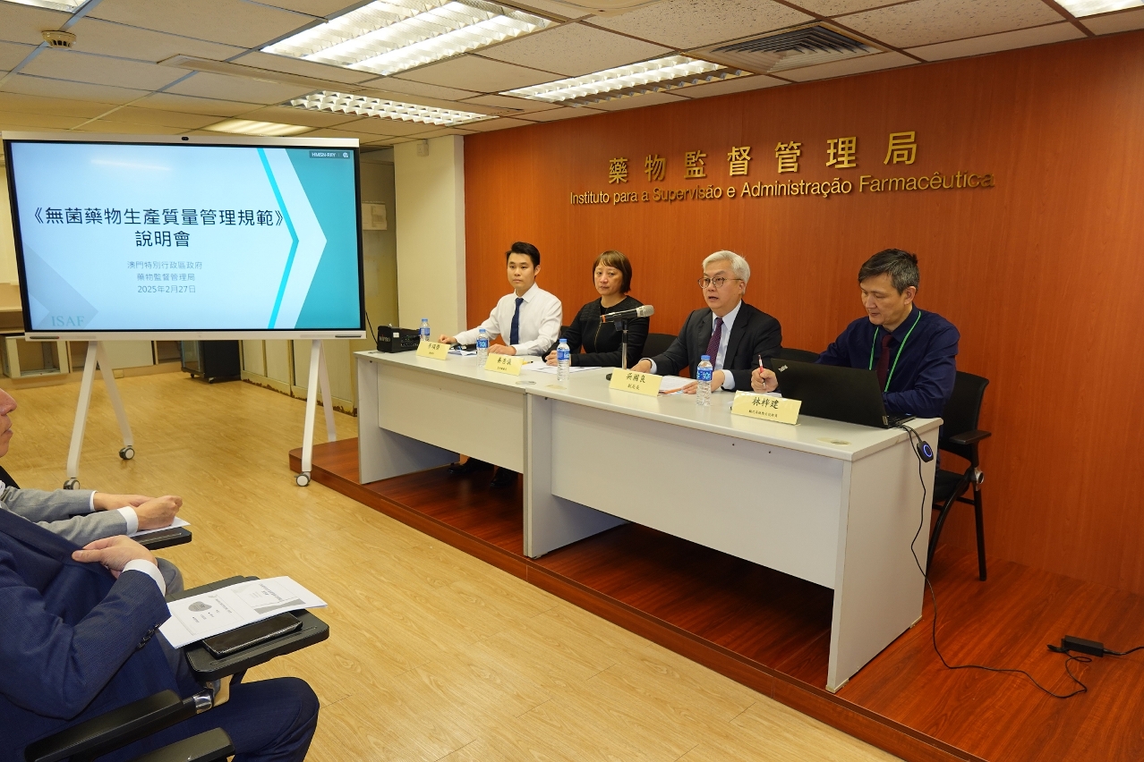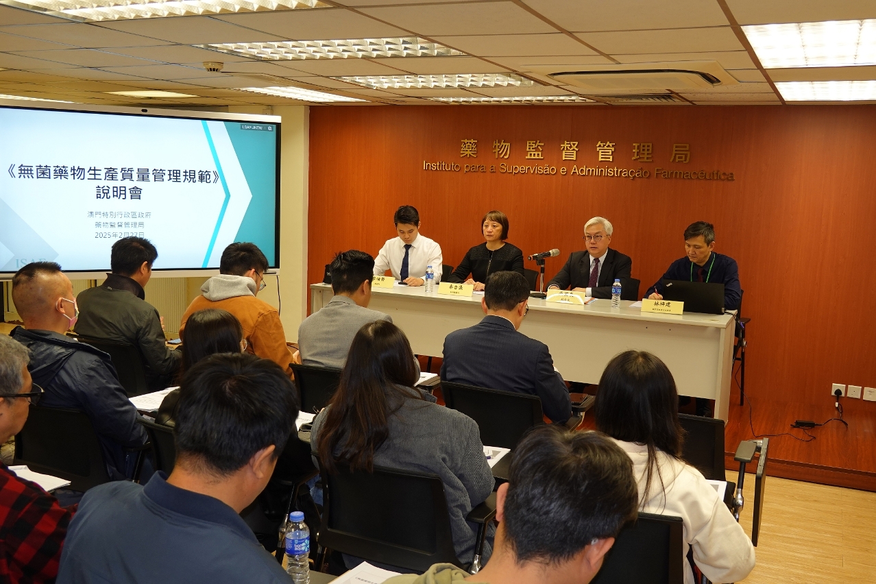 Em articulação com as “Boas práticas clínicas de medicamentos (GCP)” e as “Boas práticas de fabrico de medicamentos estéreis (GMP)” que entrarão em vigor no dia 30 de Março de corrente ano, o Instituto para a Supervisão e Administração Farmacêutica (ISAF) realizou três sessões de esclarecimento destinadas ao sector nos dias 27 de Fevereiro, 28 de Fevereiro e 7 de Março, respectivamente, para apresentar os principais conteúdos e as observações sobre as GCP e as GMP de medicamentos estéreis aos representantes das instituições médicas, das instituições de ensino superior, das associações comerciais e do sector farmacêutico de Macau.