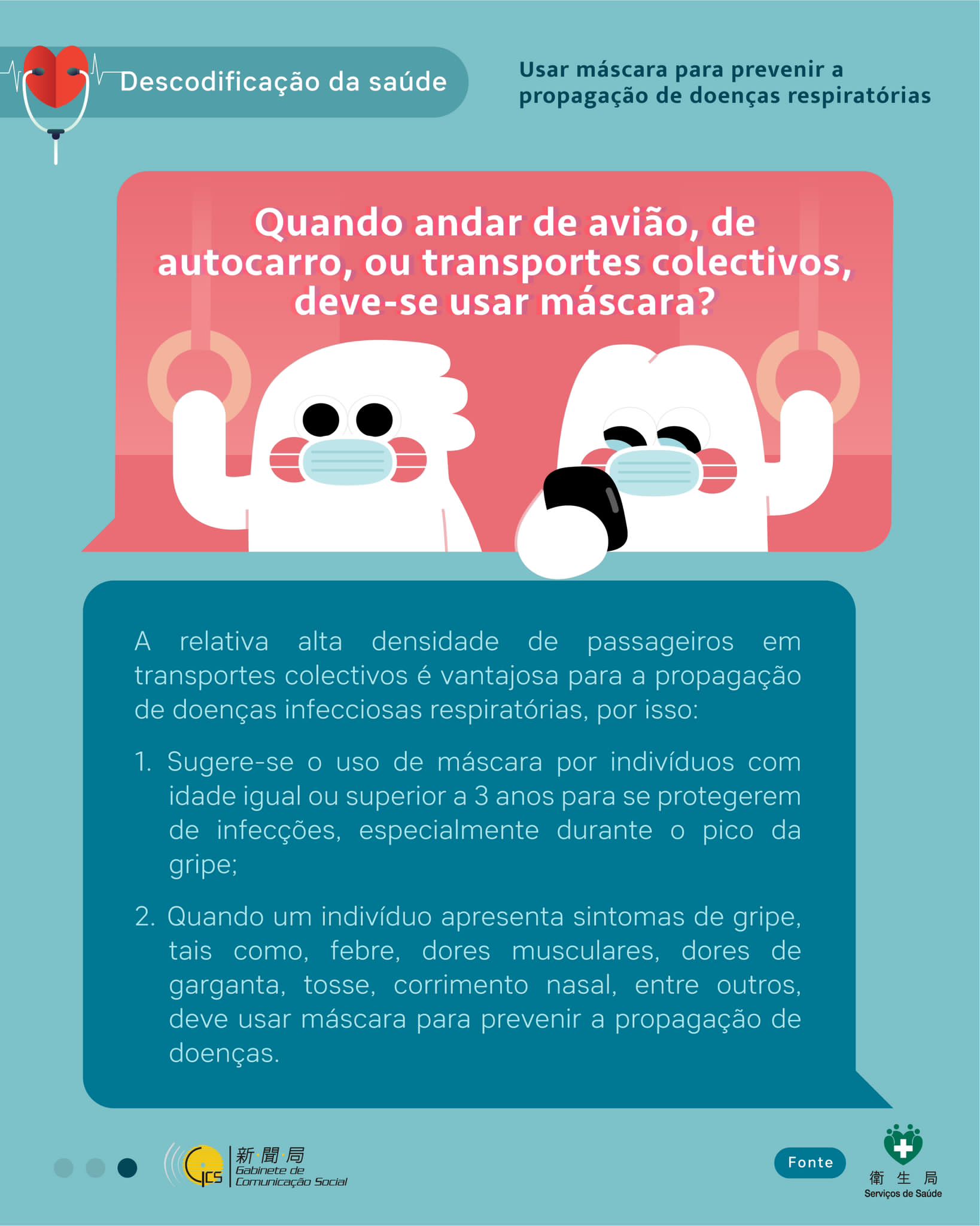 Com vista a diminuir a infecção da gripe, da COVID-19 e de outras doenças transmissíveis do tracto respiratório superior, os Serviços de Saúde pretendem sensibilizar, mais uma vez, os residentes para adopção das seguintes medidas de prevenção: