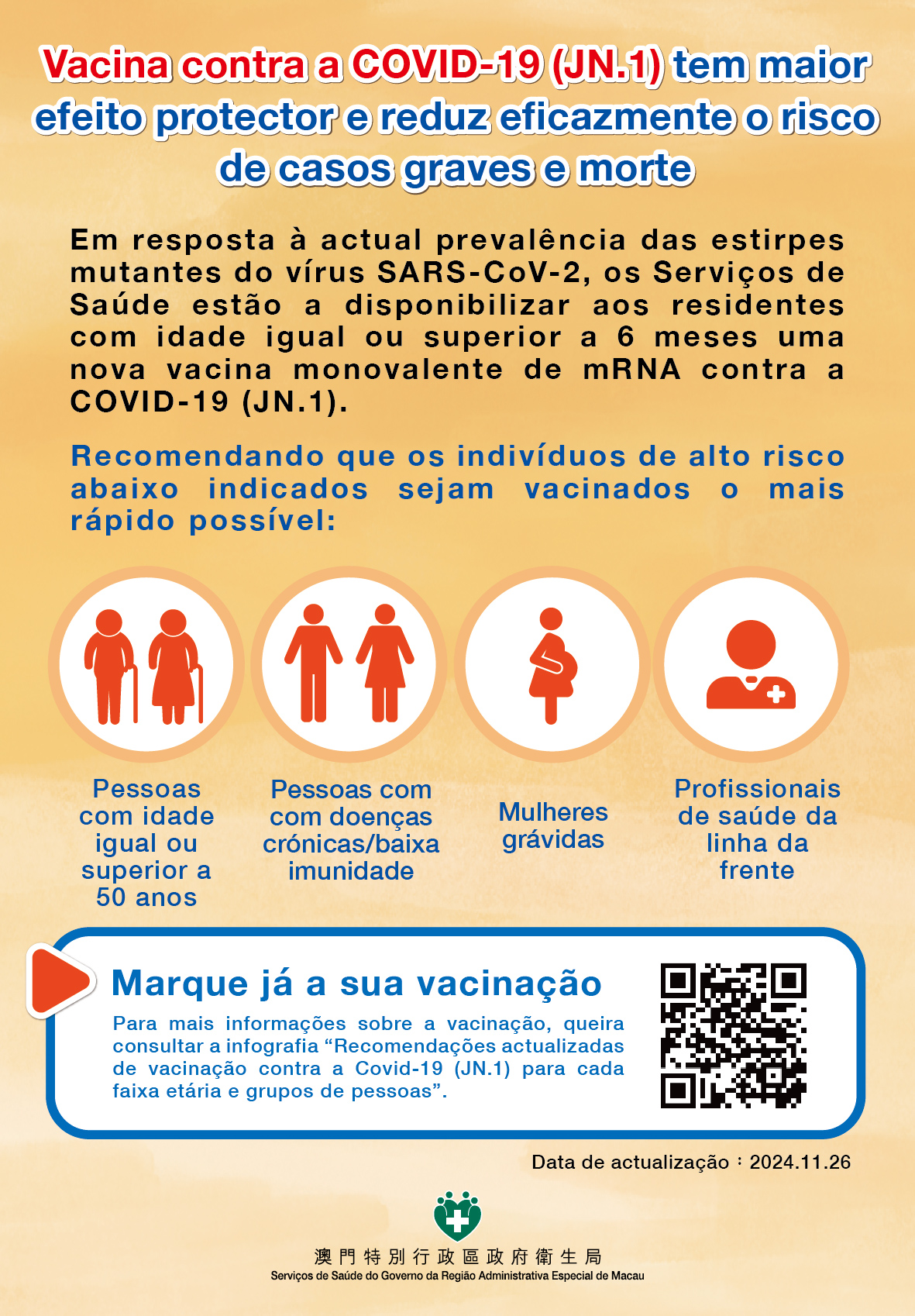 Desde o início deste ano até o momento, em Macau não foi registado nenhum caso grave ou de morte relacionado com vírus SARS-CoV-2. No entanto, tendo em conta que as pessoas de alto risco, nomeadamente os idosos, portadores de doenças cronicas graves, pessoas com sistema imunológico enfraquecido correm maior risco de doenças graves ou de morte, após a infecção, os Serviços de Saúde recomendam às pessoas supracitadas o reforço de prevenção e à inoculação da vacina JN.1 contra a Covid-19, o mais rápido possível.