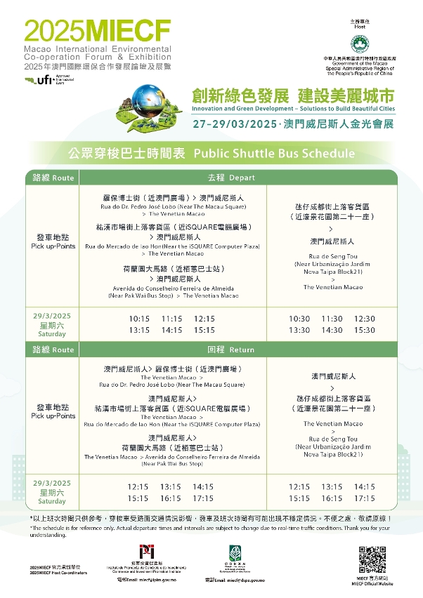 O Fórum e Exposição Internacional de Cooperação Ambiental de Macau 2025 (2025MIECF) decorre de 27 a 29 de Março, na Cotai Expo, The Venetian Macao. Com o crescimento da consciência global sobre questões ambientais, este evento consolida-se como uma importante plataforma verde internacional, sendo o seu tema central “Inovação e Desenvolvimento Verde — Soluções para a Construção de Cidades Belas”.