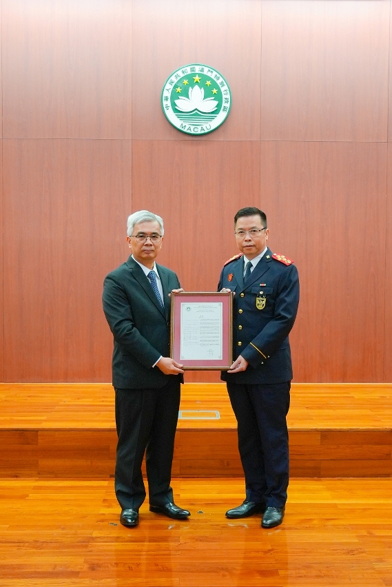 O Secretário para a Segurança, Wong Sio Chak, hoje (dia 31), atribuiu louvores ao Comandante do Corpo de Bombeiros (CB), Leong Iok Sam, e à Directora da Direcção dos Serviços das Forças de Segurança de Macau (DSFSM), Kok Fong Mei, em reconhecimento do desempenho nas suas vidas profissionais na função pública, há mais de 30 anos, e em agradecimento pelos contributos que deram às forças de segurança de Macau.