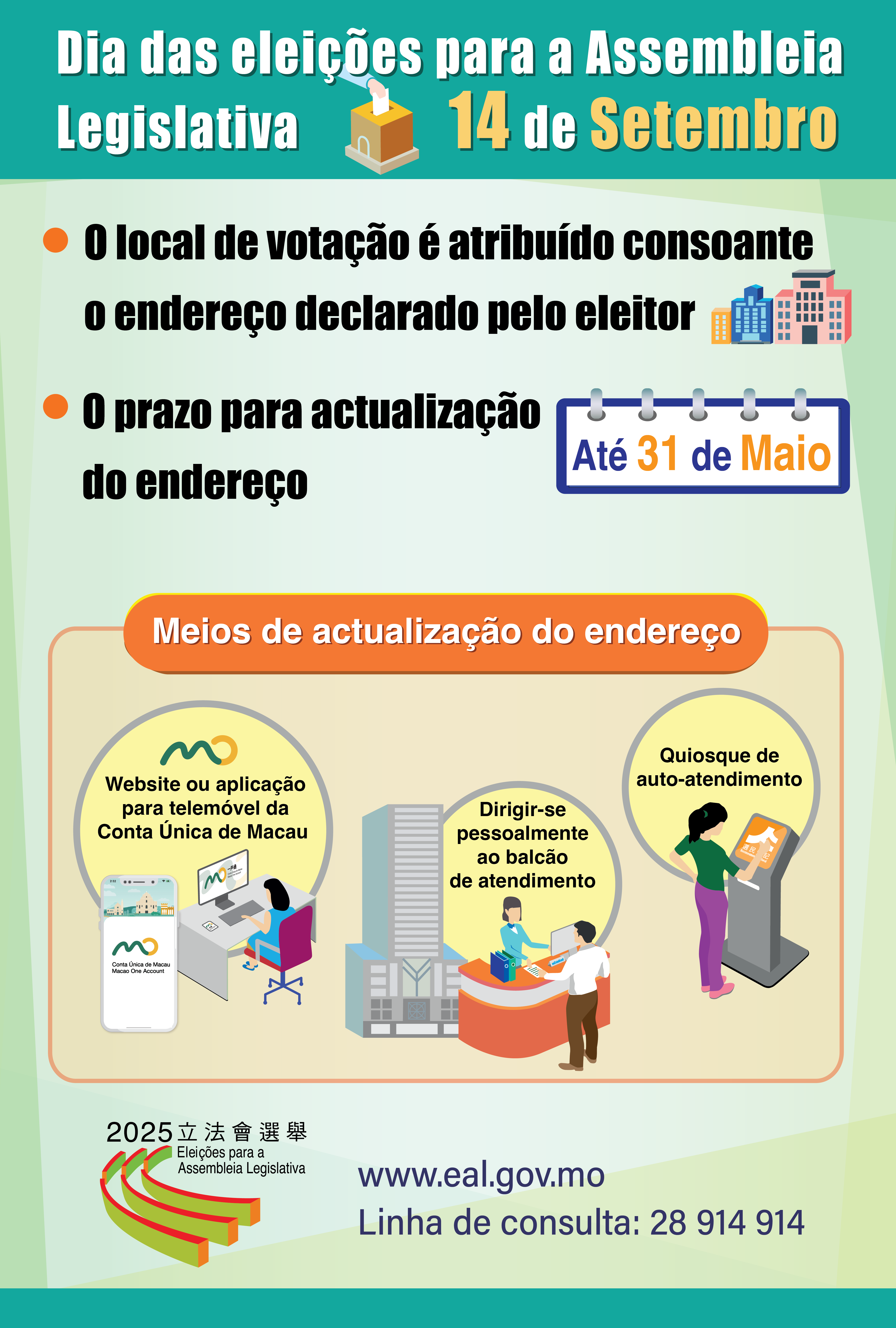 Os eleitores devem actualizar o endereço declarado no recenseamento eleitoral, até 31 de Maio, através da Conta Única de Macau, página electrónica do Recenseamento Eleitoral (www.re.gov.mo) , quiosques de auto-atendimento (lista de localização, consulte (https://www.re.gov.mo/pt/s/briefCKiosk.html#kiosk), ou de forma presencial, no Balcão de Assuntos Eleitorais, sito no rés-do-chão do Edifício Administração Pública, na Rua do Campo.