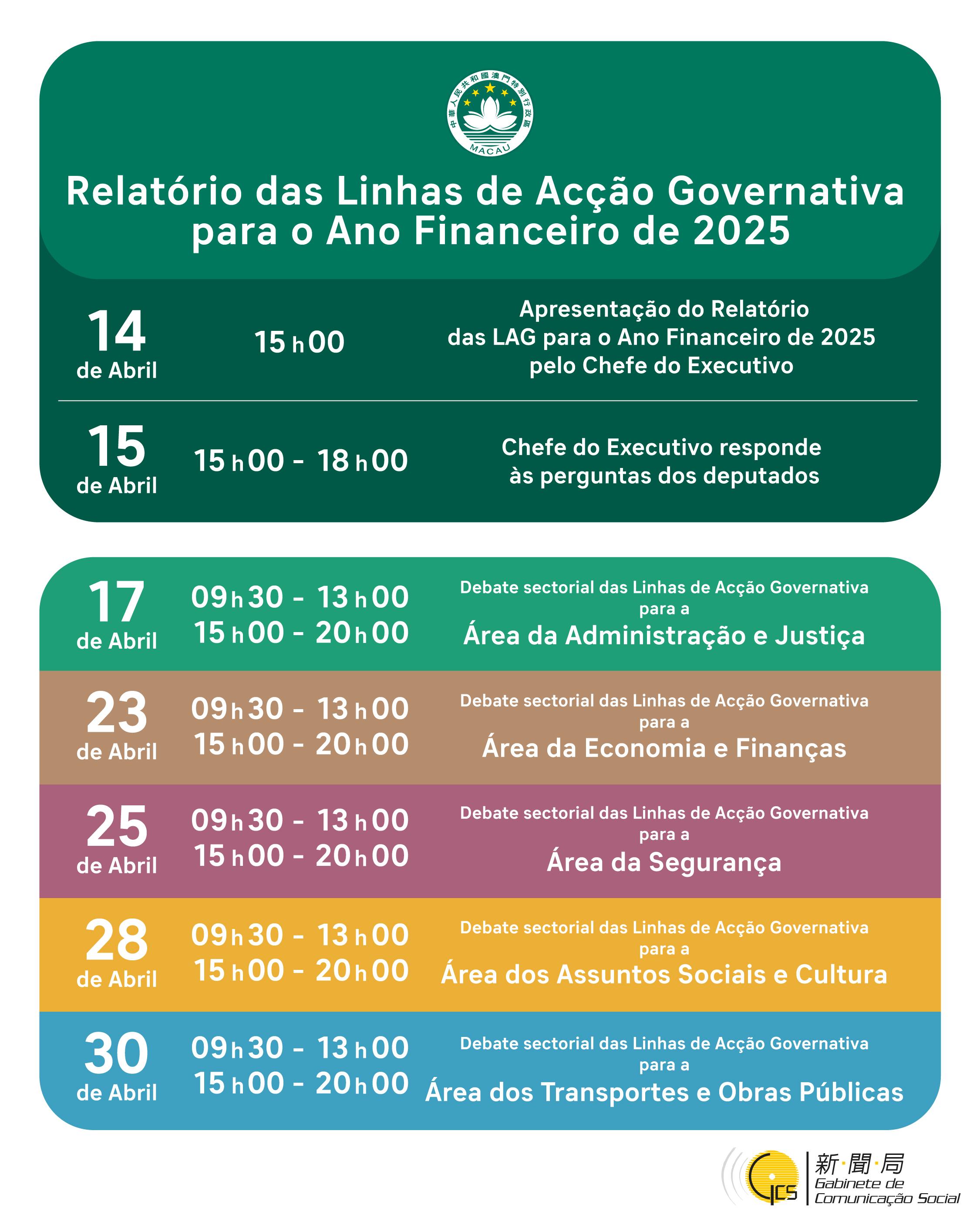 Os debates sectoriais das Linhas de Acção Governativa na Assembleia Legislativa serão realizados sucessivamente, estando prevista a discussão na seguinte ordem: Área da Administração e Justiça: dia 17 de Abril; Área da Economia e Finanças: 23 de Abril; Área da Segurança: 25 de Abril; Área dos Assuntos Sociais e Cultura: 28 de Abril; Área dos Transportes e Obras Públicas: 30 de Abril.