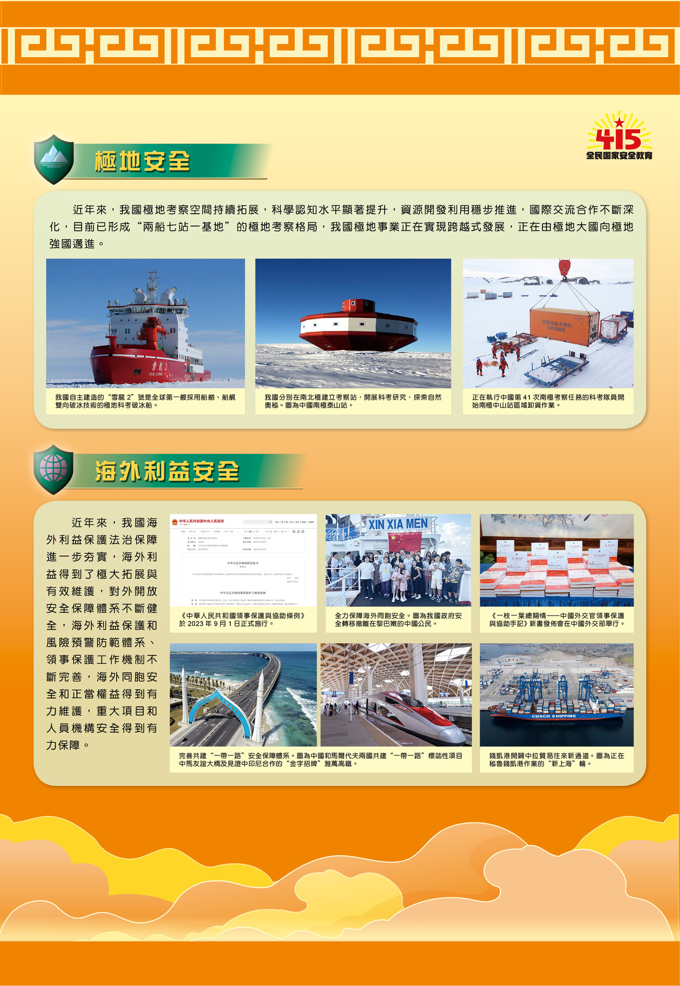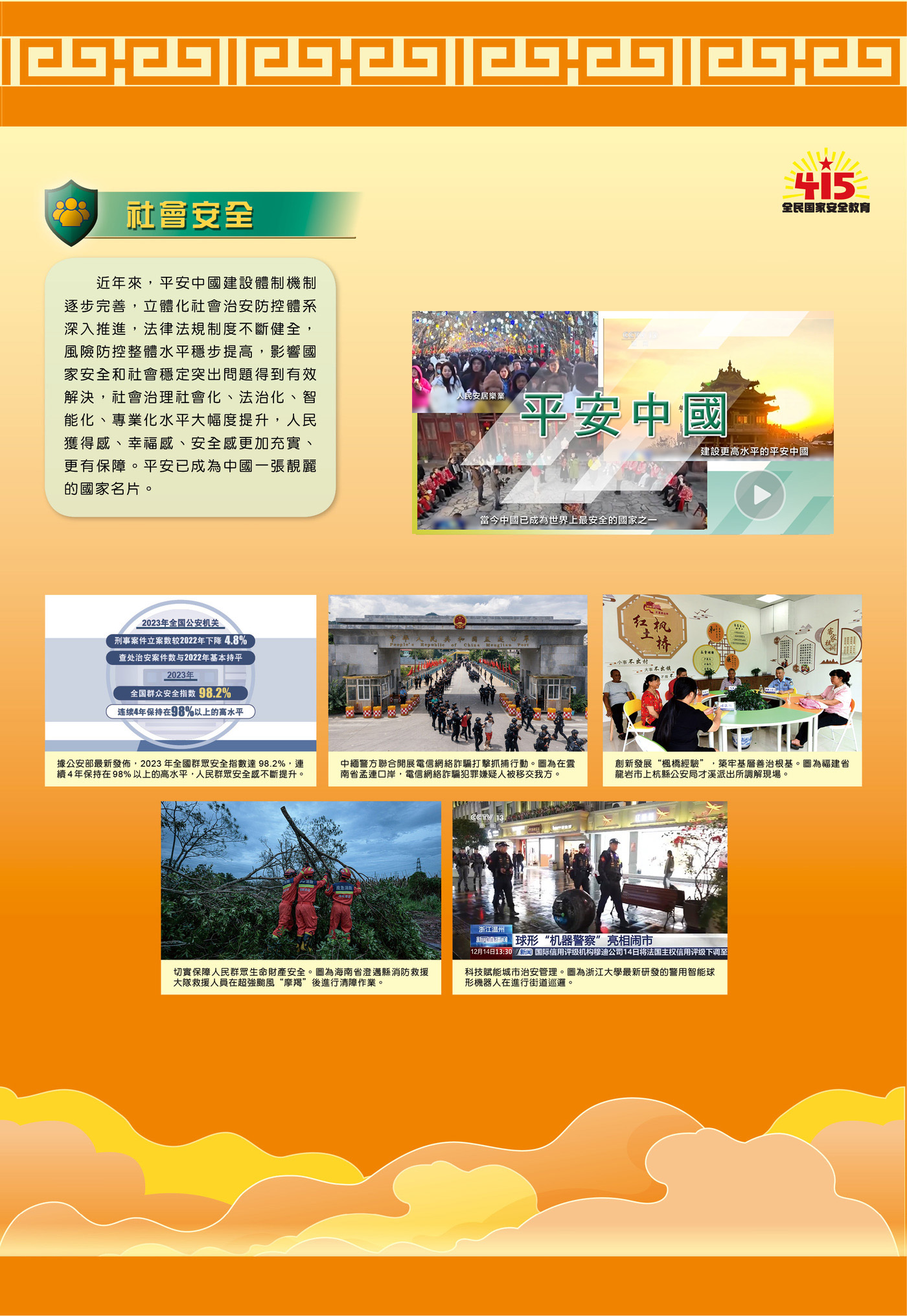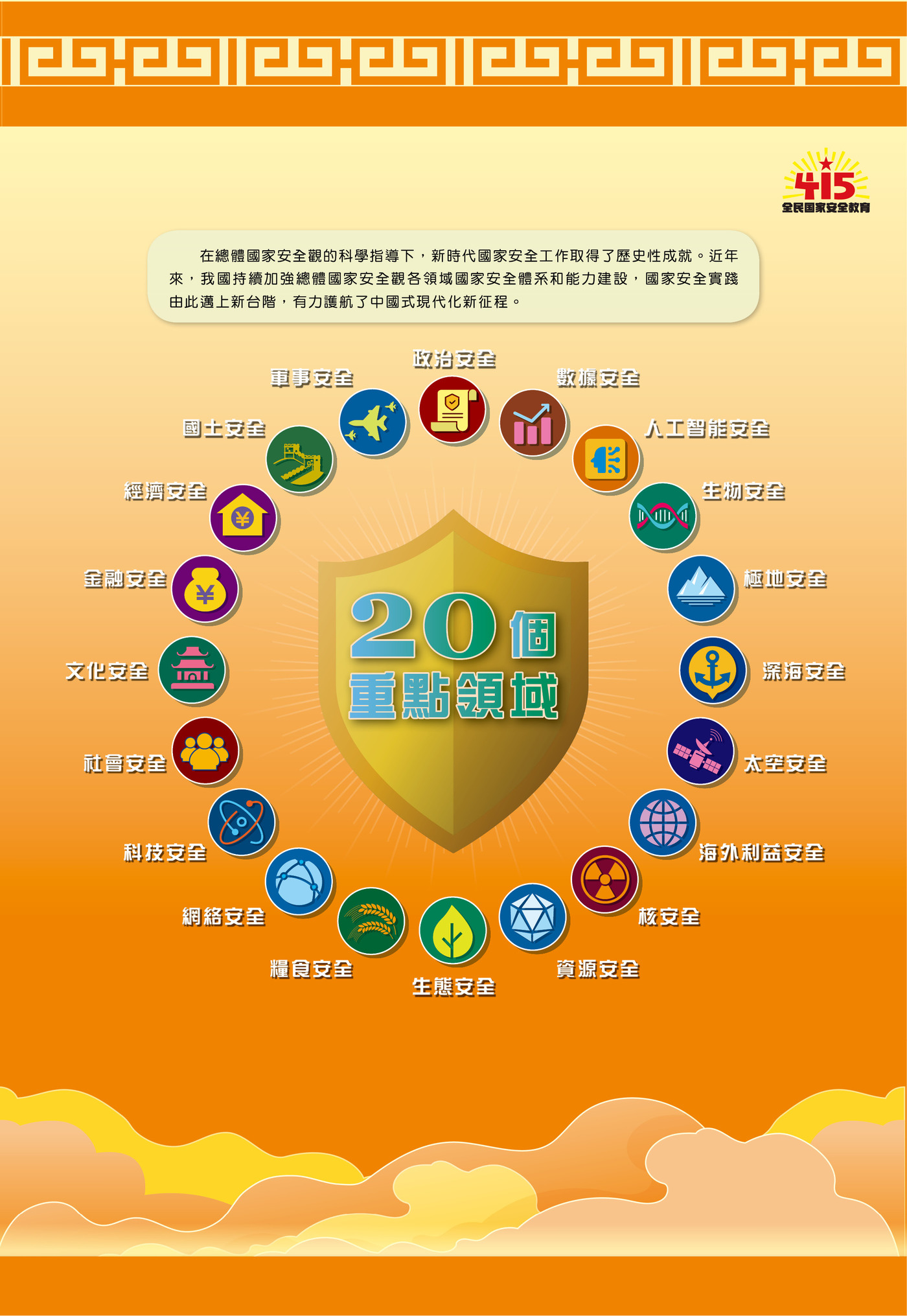 A perspectiva geral da segurança nacional abrange 20 domínios-chave estreitamente interligados, incluindo a segurança política, a segurança militar, a segurança territorial, a segurança económica, a segurança financeira, a segurança científica e tecnológica, a segurança da inteligência artificial, a cibersegurança, a segurança de dados, a segurança da sociedade, a segurança cultural, a segurança alimentar, a segurança ecológica, a segurança biológica, a segurança de recursos, a segurança nuclear, a segurança espacial, a segurança em águas profundas, a segurança polar e a segurança dos interesses no exterior. A segunda parte da exposição mostra os resultados significativos alcançados pela nação na salvaguarda da segurança dos referidos domínios.