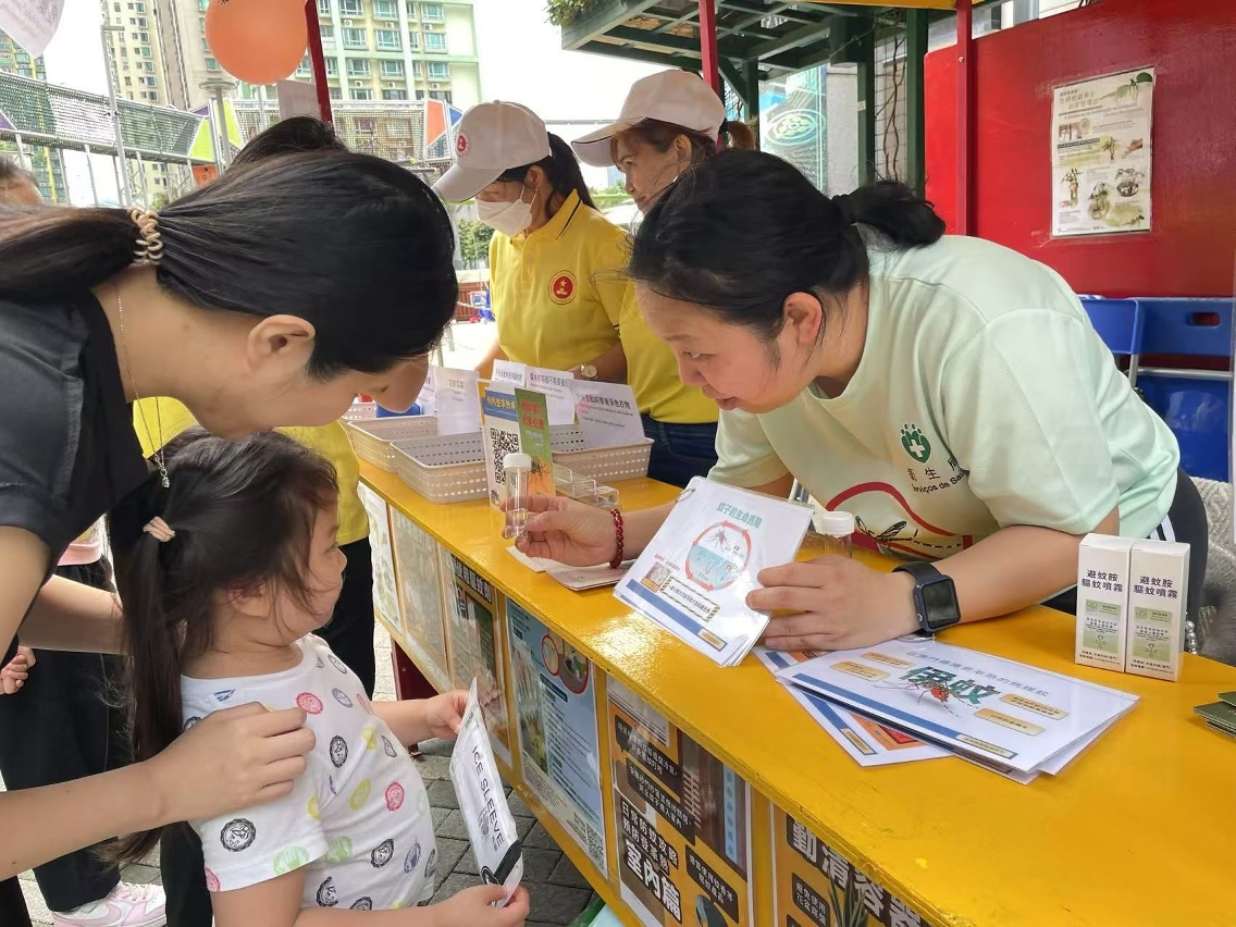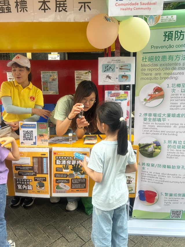 Durante a actividade, os trabalhadores interagiram activamente com os residentes através de jogos, reforçando os seus conhecimentos sobre a adopção correcta das medidas de prevenção de mosquitos. Para que compreendam mais intuitivamente a importância e a eficácia da eliminação das águas estagnadas na prevenção da febre de dengue, nos "postos de divulgação da prevenção contra a febre de dengue na comunidade", foram mostrados espécimes das larvas dos mosquitos, permitindo conhecer o processo de crescimento e os hábitos de vida dos mosquitos Aedes Albopictus. Os mosquitos Aedes Albopictus reproduzem-se principalmente em pequenas quantidades de água estagnada, limpa e parada,. Portanto, é necessário manter a higiene ambiental, eliminar as águas estagnadas nas zonas periféricas do domicílio e no local de trabalho, impedindo a proliferação de mosquitos. Em casa, podem ser instaladas redes mosquiteiras nas janelas, mosquiteiros ou ligar o ar condicionado, entre outras medidas, para reduzir a possibilidade de serem picados por mosquitos. Ao desenvolver actividades ao ar livre, pode optar por vestir roupas com mangas compridas e de cor clara, aplicar repelente anti-mosquitos com ingrediente de DEET (DEET, IR3535 e Icaridin) nas partes expostas da pele ou nas roupas. Em caso de sintomas suspeitos de febre de dengue, como febre e erupção cutânea, deve recorrer de imediato ao médico e informar o médico sobre o local de residência ou histórico de viagem.