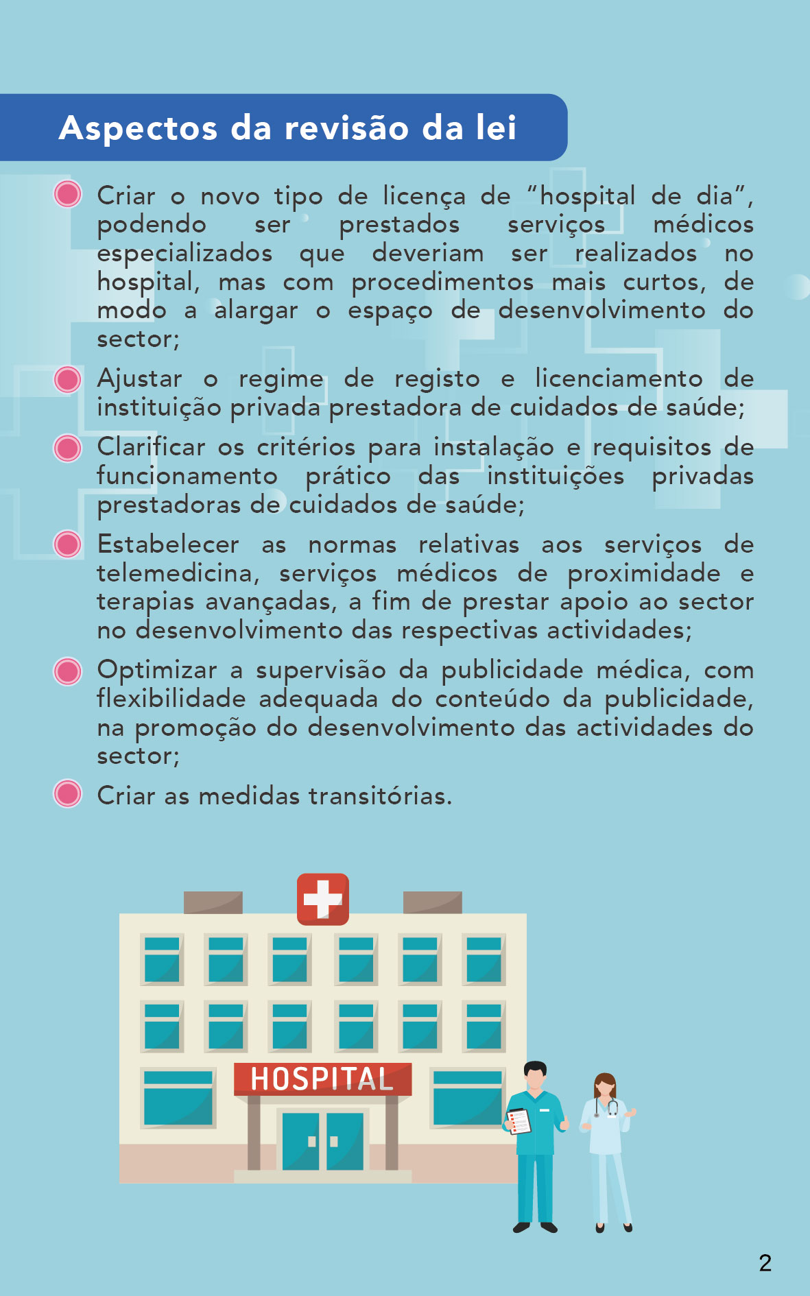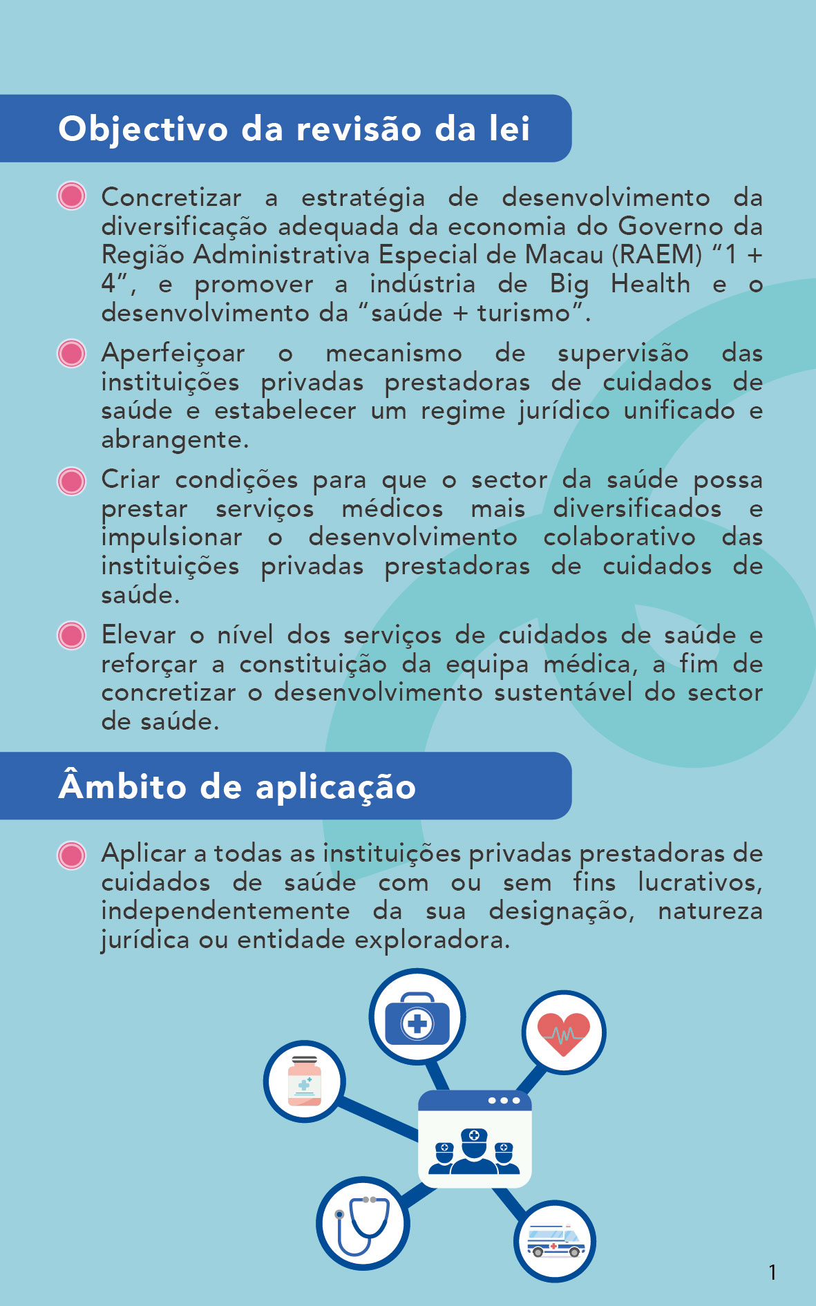 Vários participantes defenderam o aperfeiçoamento do «Regime jurídico para o exercício de actividade das instituições privadas prestadoras de cuidados de saúde» por parte do Governo da RAEM, e consideram que pode apoiar o sector da saúde de Macau a desenvolver serviços médicos mais diversificados, mas o Governo deve ter uma certa flexibilidade na elaboração das normas. Alguns participantes concordaram com o alargamento adequado do conteúdo da publicidade médica, no sentido de alargar, da melhor forma, o espaço de divulgação do sector, ao garantir que os utentes recebam informações médicas correctas. Houve ainda participantes que consideraram que o funcionamento do Hospital de Dia deve ser rigorosamente supervisionado, a fim de proteger a saúde e a segurança do público.