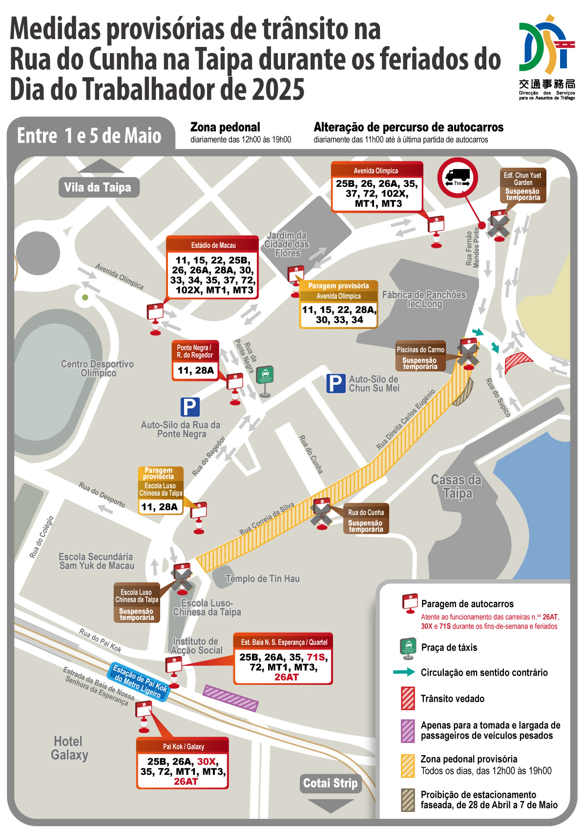 Obs.: Os detalhes sobre o plano da zona pedonal provisória no bairro antigo da Taipa podem ser consultados na página electrónica da DSAT: https://www.dsat.gov.mo/dsat/news_detail.aspx?a_id=8EC738D36666AEFD3044C5ADCFA7FFCB