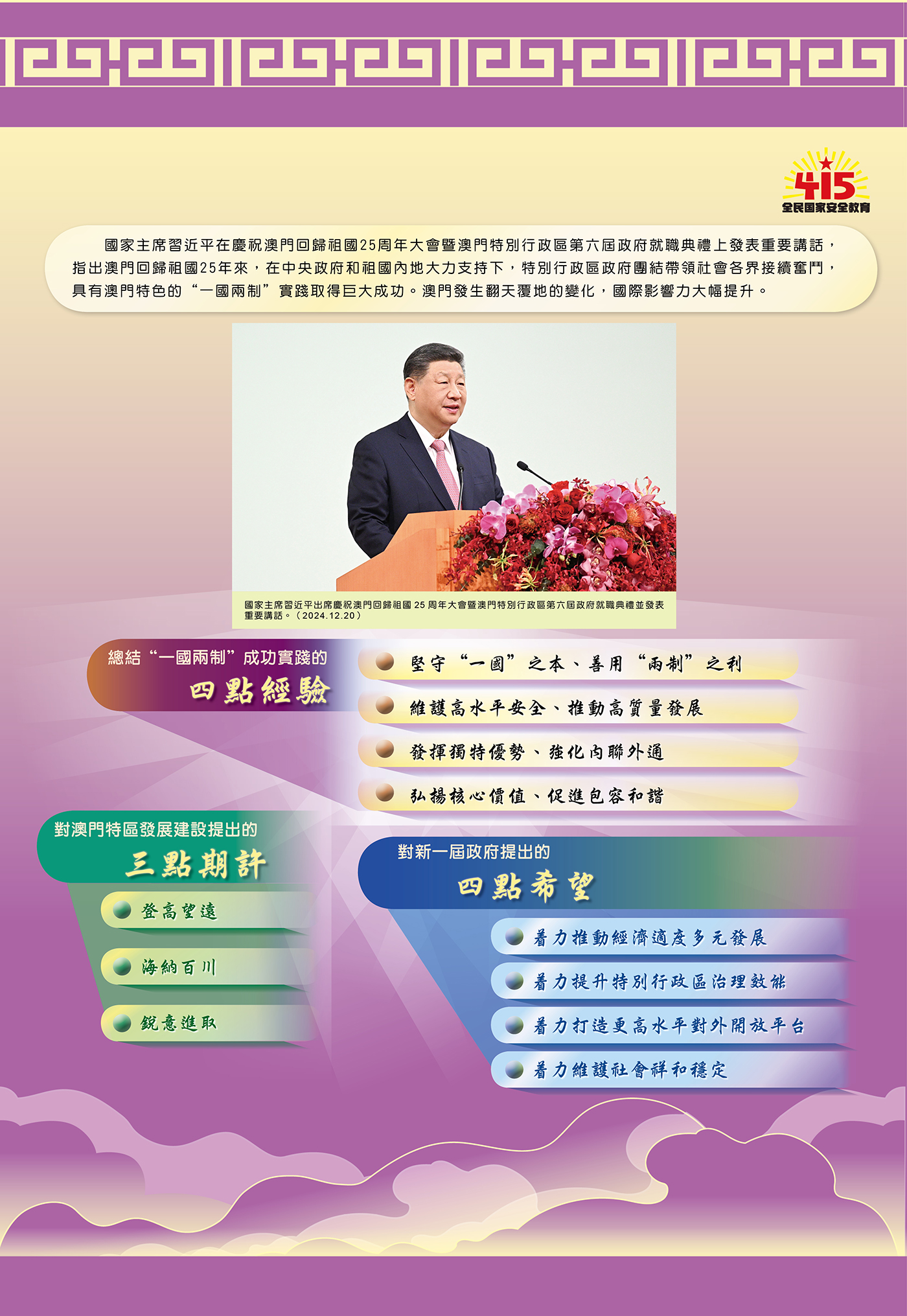 O novo governo da RAEM reuniu e liderou todos os sectores locais para estudar e implementar o espírito consagrado nos discursos importantes do presidente Xi Jinping. O Chefe do Executivo, Sam Hou Fai presidiu sete seminários, respectivamente com os representantes das cinco tutelas e dos Comissariados contra a Corrupção e da Auditoria, e solicitou que os funcionários de todos os serviços públicos estudem e compreendam profundamente os conteúdos, pontos de vista e metodologia dos discursos importantes do presidente Xi Jinping, articulando-os com os seus trabalhos práticos das respectivas áreas, com vista a cumprirem as suas competências efectivamente de acordo com a lei, fortalecerem o seu empenho, responsabilidade e consciência da conjuntura global.