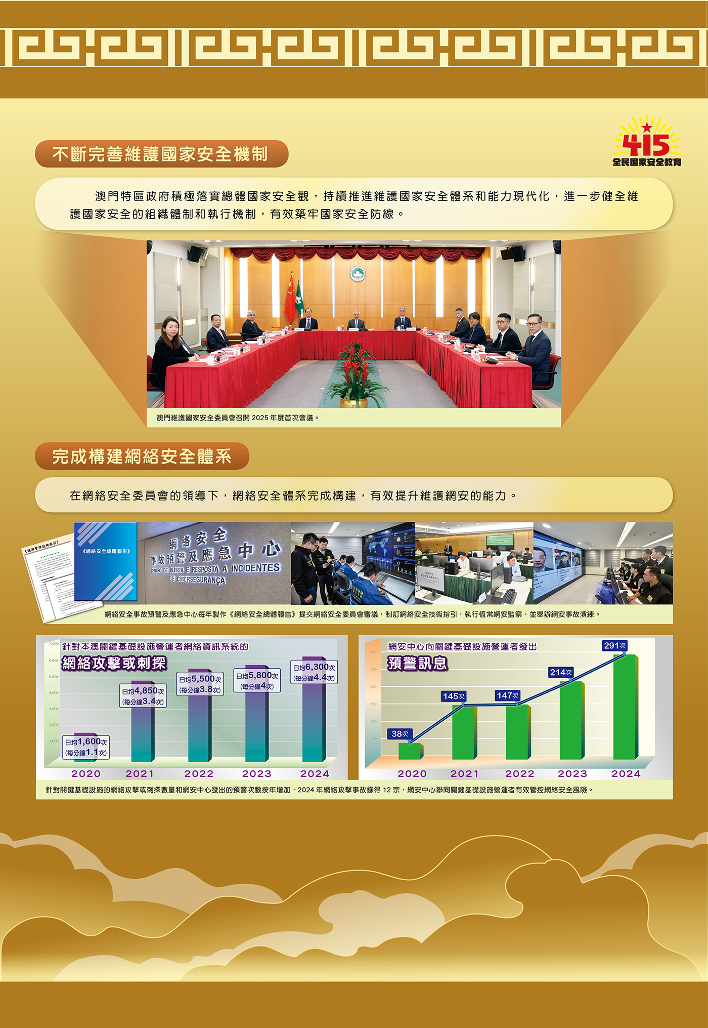 Nos últimos dez anos, sob a orientação da Perspectiva Geral da Segurança Nacional, a educação da segurança nacional na RAEM tem aprofundado de forma constante e conseguiu resultados notáveis, tem aumentado a consciência de segurança nacional de toda a população, tem contribuído para a transmissão entre as gerações da tradição do amor à Pátria e a Macau. A Exposição sobre a Educação da Segurança Nacional, co-organizada pelo Governo da RAEM e o Gabinete de Ligação do Governo Popular Central na RAEM, realiza-se pela oitava vez, registando, até o dia 1 de Maio, mais de 36 mil visitantes e mais de 92 727 navegações na respectiva página electrónica.