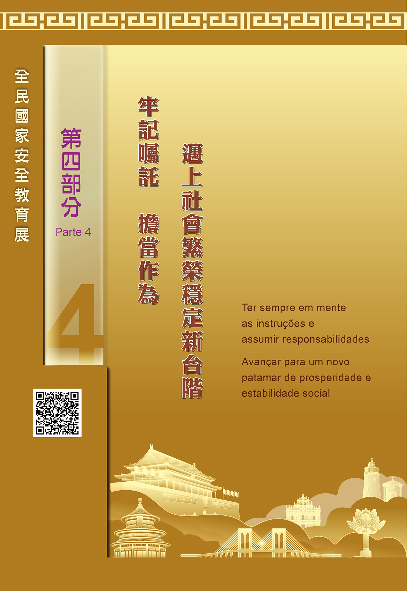 O tema da quarta parte da exposição é «Ter sempre em mente as instruções e assumir responsabilidades - Avançar para um novo patamar de prosperidade e estabilidade social». Sob a orientação renovada e instrução científica da Perspectiva Geral da Segurança Nacional, o governo da RAEM continua a aperfeiçoar o regime jurídico de salvaguarda da segurança nacional, lançou uma série de leis e regulamentos relativos à segurança nacional, e promove a legislação complementar sobre a segurança nacional. A RAEM concluiu as alterações da Lei Eleitoral para o Chefe do Executivo e da Lei Eleitoral para a Assembleia Legislativa da RAEM, garantindo, com base no regime jurídico e ao nível de mecanismo de implementação, que as pessoas que participem nas respectivas eleições sejam patriotas, fazendo com que o princípio de “Macau governado por patriotas” seja concretizado efectivamente. Ao mesmo tempo, o governo da RAEM concretiza activamente a Perspectiva Geral da Segurança Nacional, continua a aperfeiçoar o sistema institucional e o mecanismo de implementação, consolida efectivamente a linha de defesa da segurança nacional.