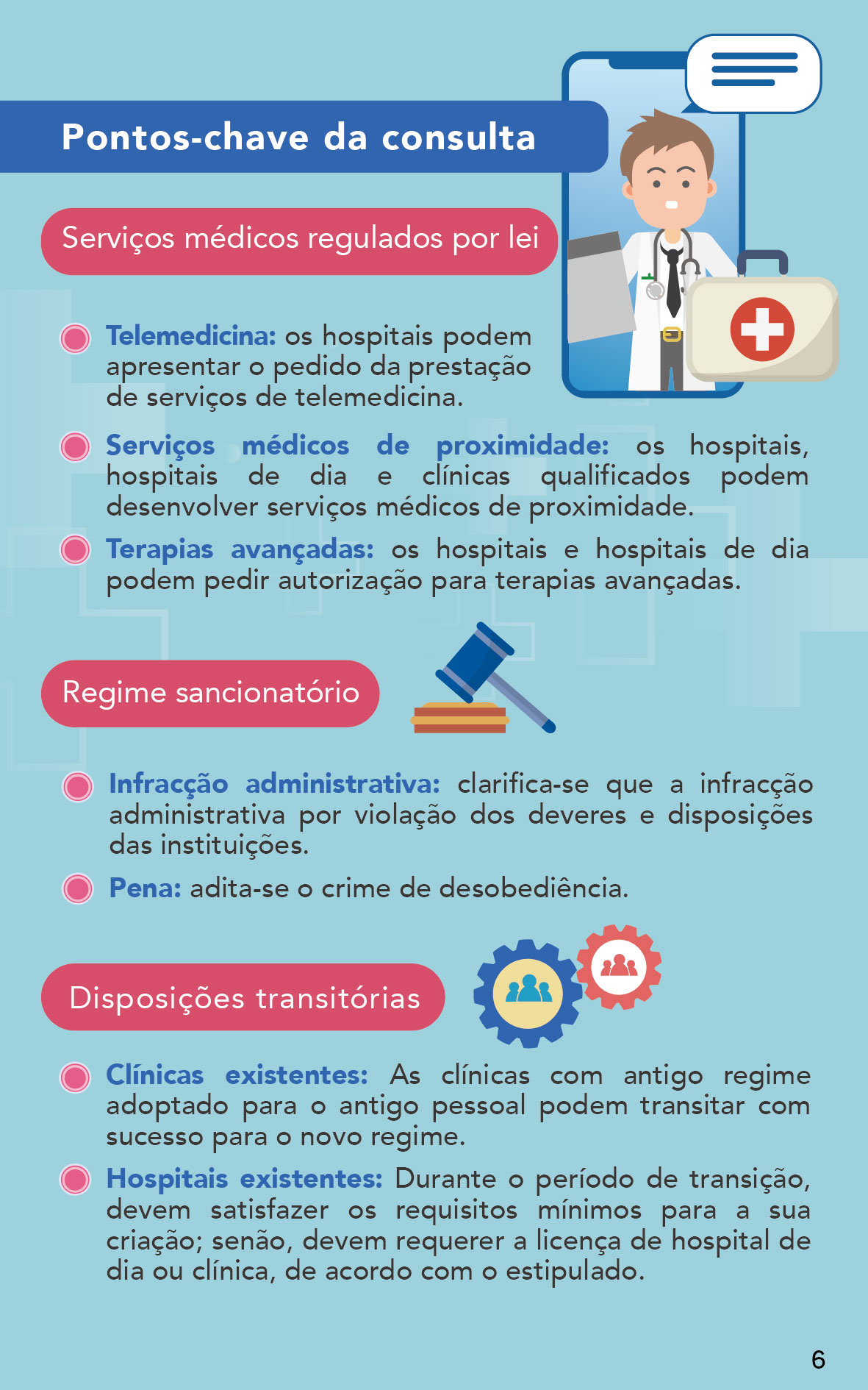 Os participantes concordaram, de um modo geral, com a orientação legislativa do “Regime jurídico para o exercício de actividades das instituições privadas prestadoras de cuidados de saúde” e apresentaram as suas opiniões em relação ao conteúdo do documento de consulta. Alguns participantes consideraram que devem ser claramente definidos os requisitos para a abertura de hospitais e hospitais de dia, incluindo a caução, a área do estabelecimento e a alocação de pessoal, a fim de garantir a qualidade dos serviços médicos; Além disso, houve participantes que apoiaram a produção legislativa para regulamentar claramente os serviços extensivos e de telemedicina, considerando que pode elevar eficazmente a acessibilidade dos cuidados de saúde, para que mais idosos e pessoas com dificuldades de locomoção possam ser beneficiados. Existem também opiniões que concordam que permitir que os hospitais de dia prestem serviços médicos especializados, tais como a terapia celular e a procriação medicamente assistida, o que pode promover eficazmente o desenvolvimento da “saúde + turismo”.