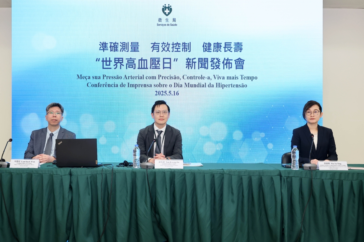 Com vista a concretizar os objectivos gerais e indicadores definidos no “Plano de Acção para Macau Saudável”, o Governo da RAEM tem promovido activamente o programa “Comunidade Saudável”, através da cooperação interdepartamental do Governo, em articulação com as associações e instituições, no sentido de produzir efeitos sinérgicos, desenvolvendo de modo contínuo actividades de divulgação científica sobre saúde comunitária, combinando formas online e presencial, centrando-se em duas grandes vertentes – “promoção de comportamentos saudáveis” e “gestão activa da saúde”, o Programa impulsiona uma série de iniciativas de promoção da saúde, com o objectivo de aumentar os conhecimentos e capacidades dos residentes na prática de comportamentos saudáveis e na gestão activa da saúde. Neste sentido, os Serviços de Saúde realizaram uma conferência de imprensa no dia 16 de Maio, véspera do “Dia Mundial da Hipertensão” (17 de Maio), com o tema para este ano “Meça a sua tensão arterial com precisão, controle-a, viva mais”. Durante a conferência de imprensa, foram apresentadas as medidas de prevenção da hipertensão arterial em Macau e os trabalhos relacionados com a gestão de doenças crónicas, tendo como objectivo sensibilizar os residentes sobre a hipertensão arterial e reforçar a sua consciência de prevenção. Estiveram presentes na conferência de imprensa para partilhar idéias profissionais, o médico assistente de medicina familiar na área de cuidados de saúde comunitários dos Serviços de Saúde, Dr. Tam Kwong Ho, o médico assistente de cardiologia do Centro Hospitalar Conde de São Januário, Dr. Lam Kuok Wun, bem como a médica assistente de saúde pública da Divisão de Promoção da Saúde do Centro de Prevenção e Controlo de Doenças dos Serviços de Saúde, Dra. Ng Nga Teng.