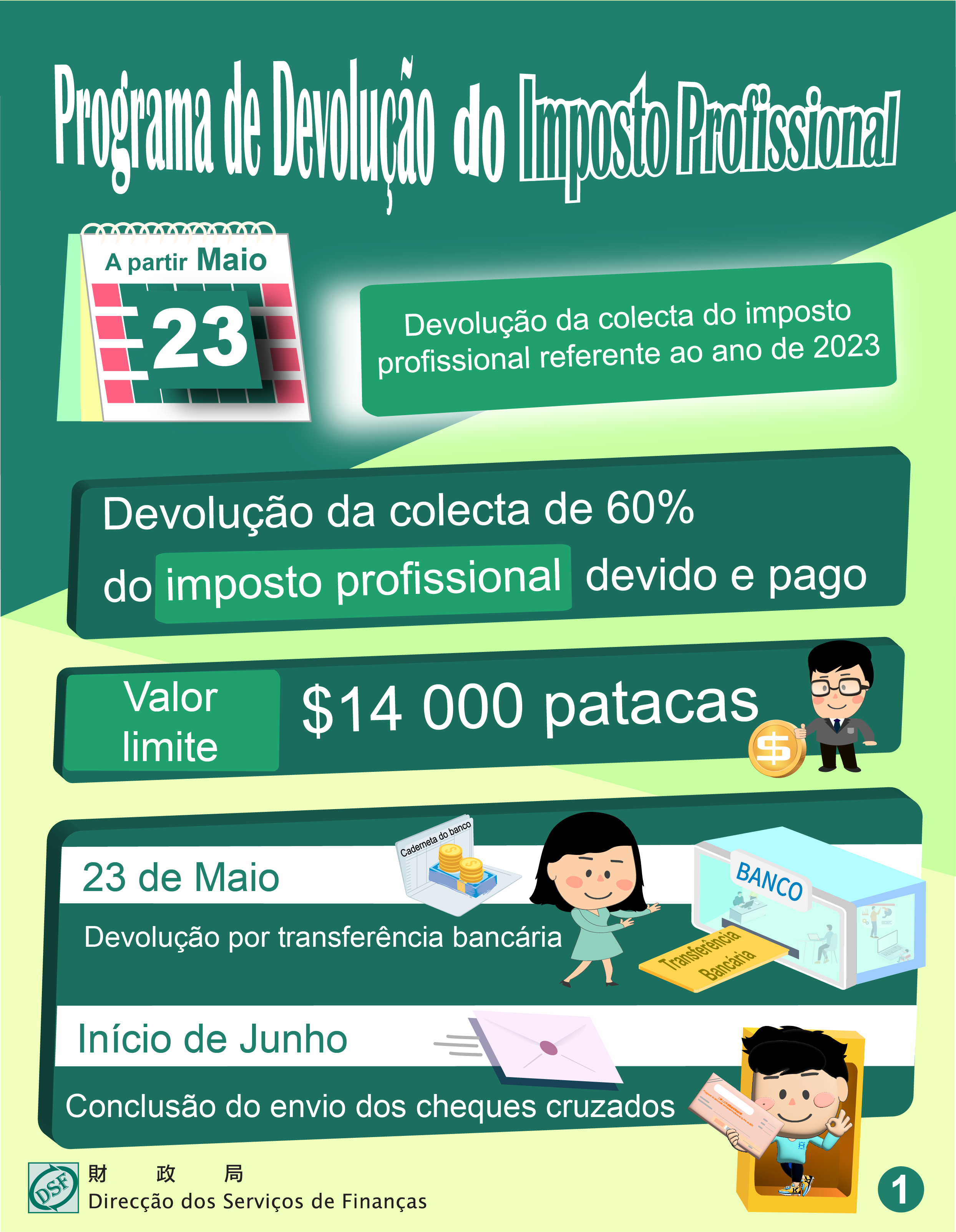 Nos termos do artigo 20.º da Lei n.º 25/2024 “Lei do Orçamento de 2025”, a partir de 23 de Maio, a Direcção dos Serviços de Finanças (DSF) procede, de forma ordenada, à devolução de 60% da colecta do imposto profissional devido e pago relativamente ao ano de 2023, a cerca de 165,000 contribuintes do imposto profissional, titulares de bilhete de identidade residente da RAEM em 31 de Dezembro de 2023, até valor limite de $14 000 patacas, sendo o montante total de devolução envolvido de aproxidamente 980 milhões de patacas.