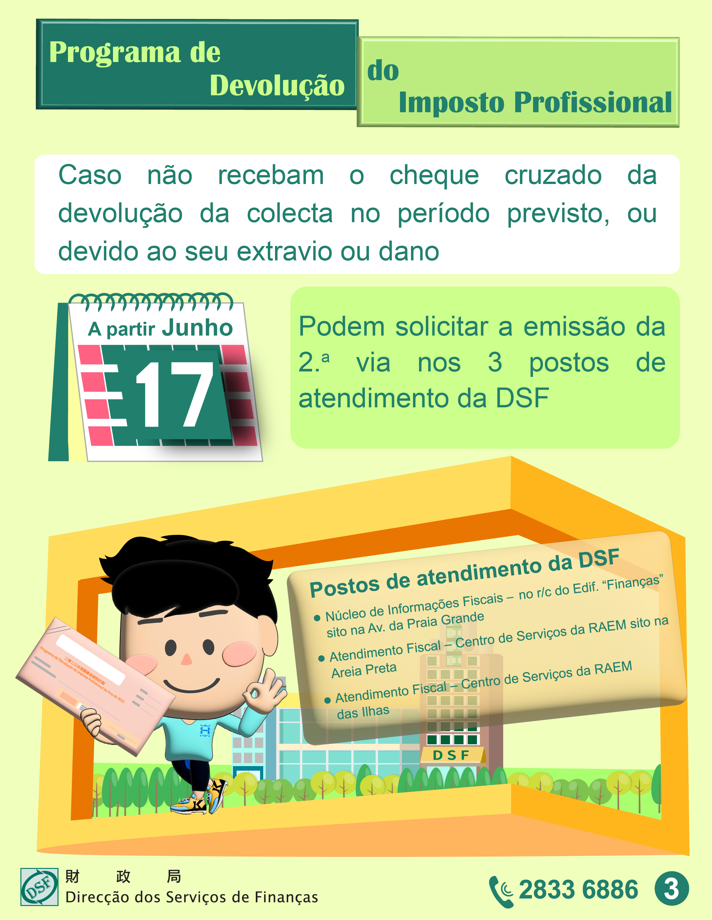 Caso os contribuintes não recebam o cheque cruzado da devolução da colecta no período previsto, ou em caso do seu extravio ou dano, podem solicitar a emissão de 2.a via do mesmo nos três postos de atendimento da DSF a partir do dia 17 de Junho.