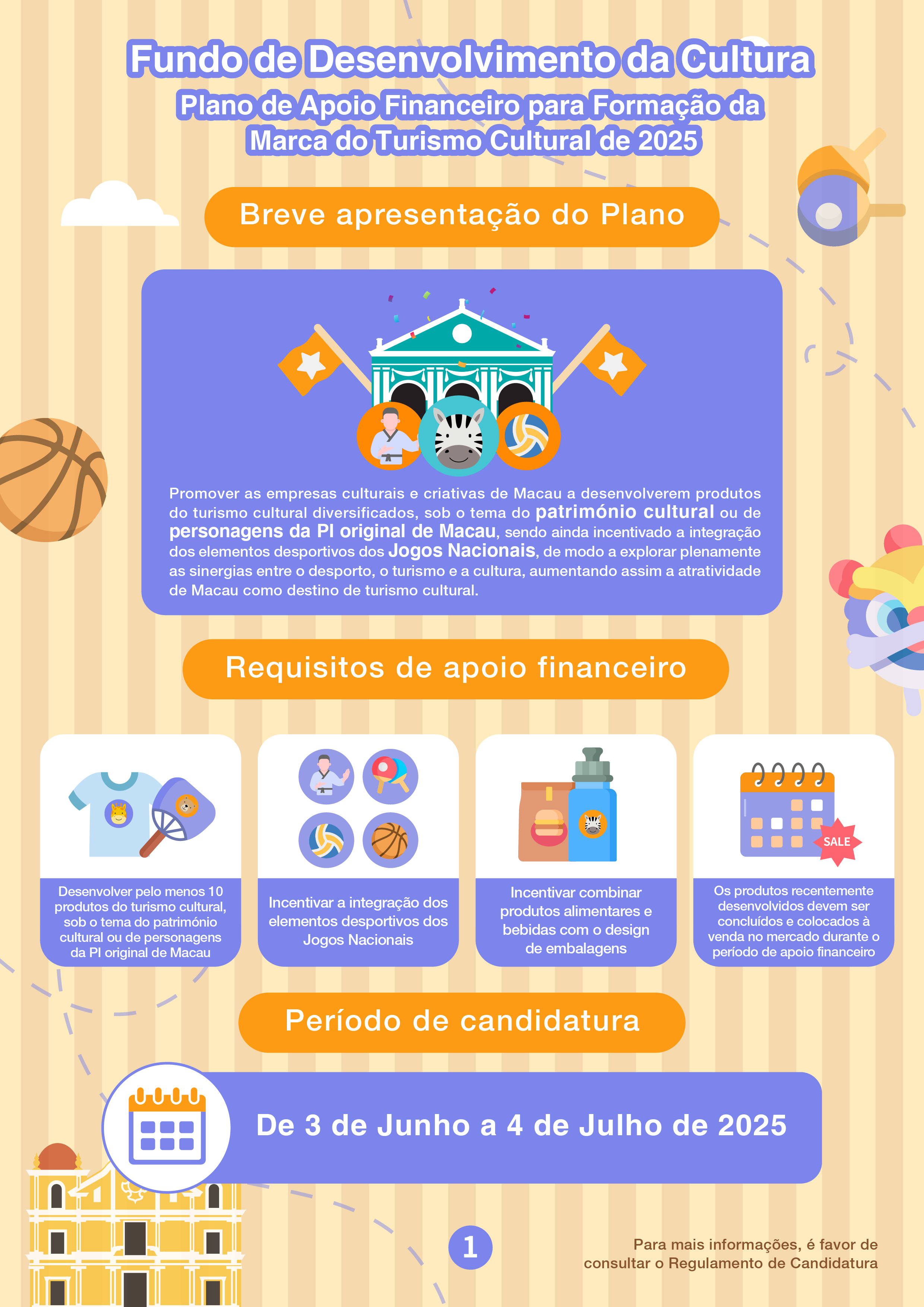 O período de candidatura do “Plano de Apoio Financeiro para Formação da Marca do Turismo Cultural de 2025” decorrerá de 3 de Junho a 4 de Julho, visando promover as empresas culturais e criativas de Macau a desenvolverem produtos do turismo cultural, sob o tema do património cultural ou de personagens da propriedade intelectual original de Macau, e que é ainda incentivada a integração dos elementos desportivos dos Jogos Nacionais, de modo a explorar as sinergias entre o desporto, o turismo e a cultura. A modalidade do apoio financeiro deste Plano é por subsídios, enquanto que o limite máximo a conceder é de 40% a 50% das despesas orçamentais do projecto, até 500 mil patacas, com um máximo de 10 quotas e um período de apoio financeiro de 24 meses.