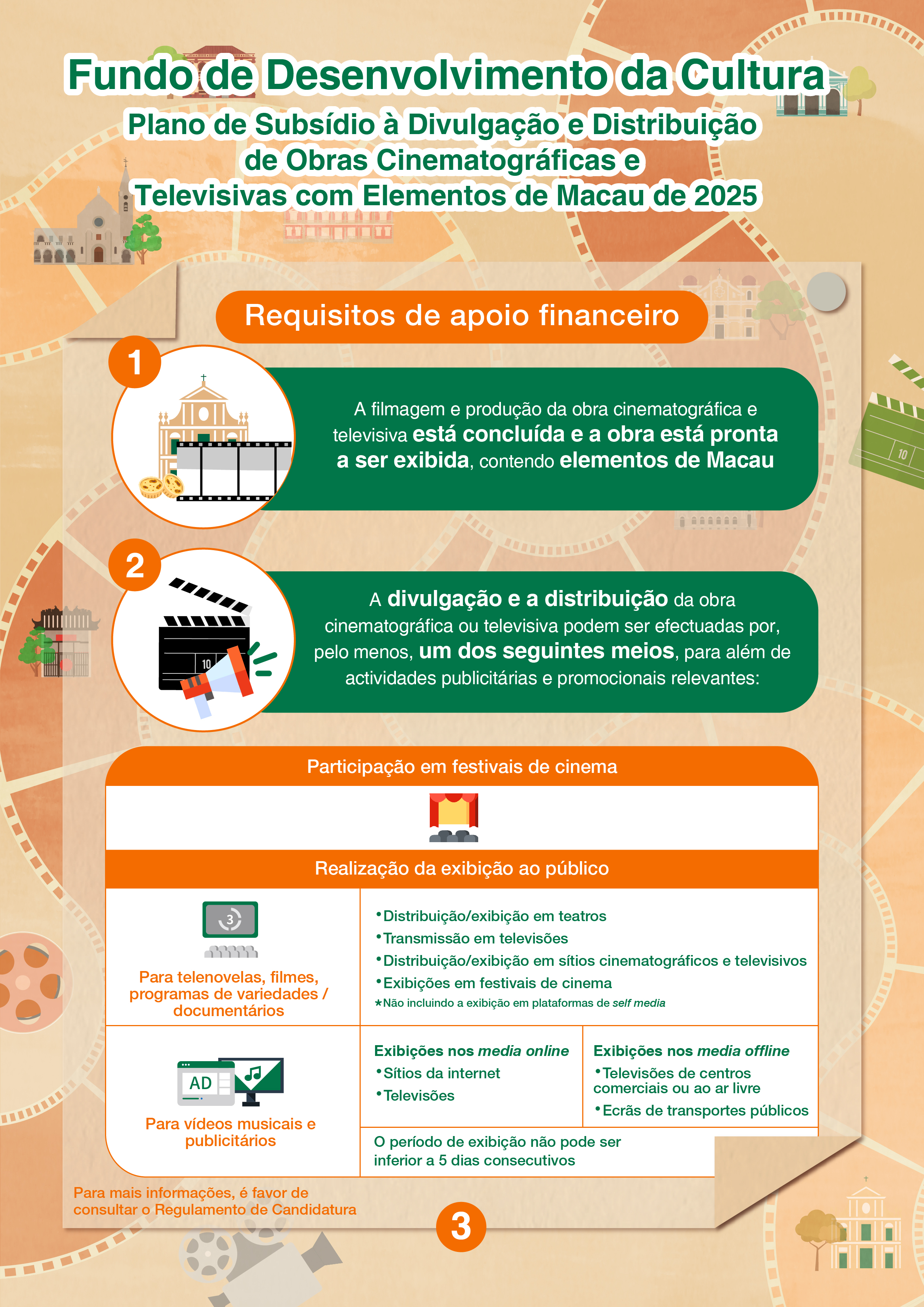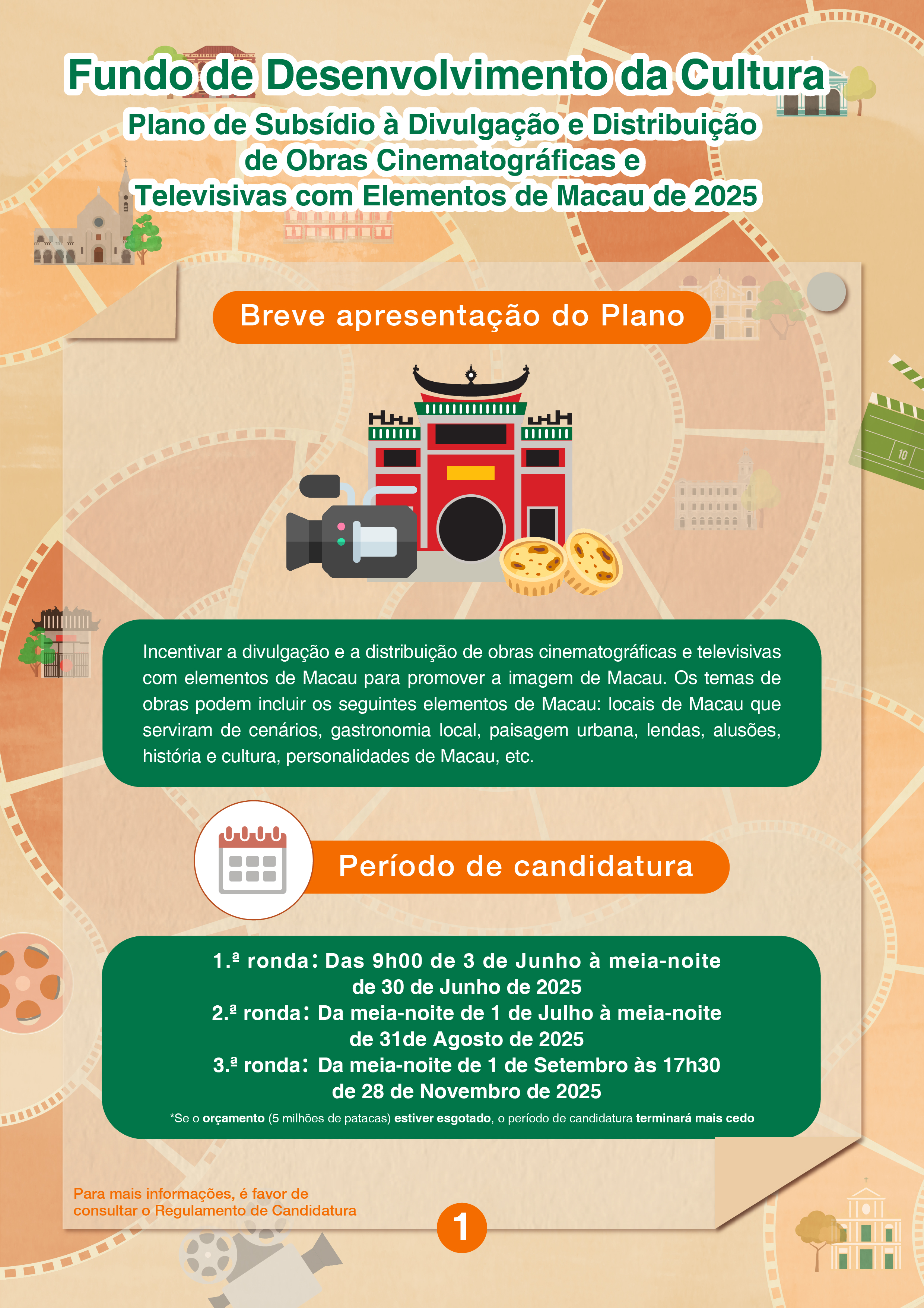 Serão três rondas de candidaturas para o “Plano de Subsídio à Divulgação e Distribuição de Obras Cinematográficas e Televisivas com Elementos de Macau de 2025”, nomeadamente, a primeira ronda de 3 a 30 de Junho; a segunda ronda de 1 de Julho a 31 de Agosto; a terceira ronda de 1 de Setembro a 28 de Novembro. Este Plano visa apoiar as obras cinematográficas e televisivas com elementos de Macau que estão concluídas e prontas a ser exibidas, cuja divulgação e distribuição serão efectuadas através da participação em festivais de cinema ou da realização da exibição ao público.