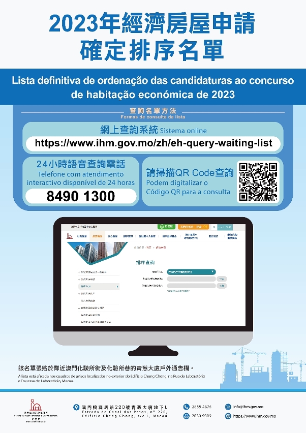 O Instituto de Habitação (IH) publicou hoje (dia 18) a lista definitiva de ordenação e a lista de exclusão do concurso de habitação económica de 2023, tendo sido admitidas 5 128 candidaturas, que foram classificadas e ordenadas e excluídas 1 434 candidaturas.