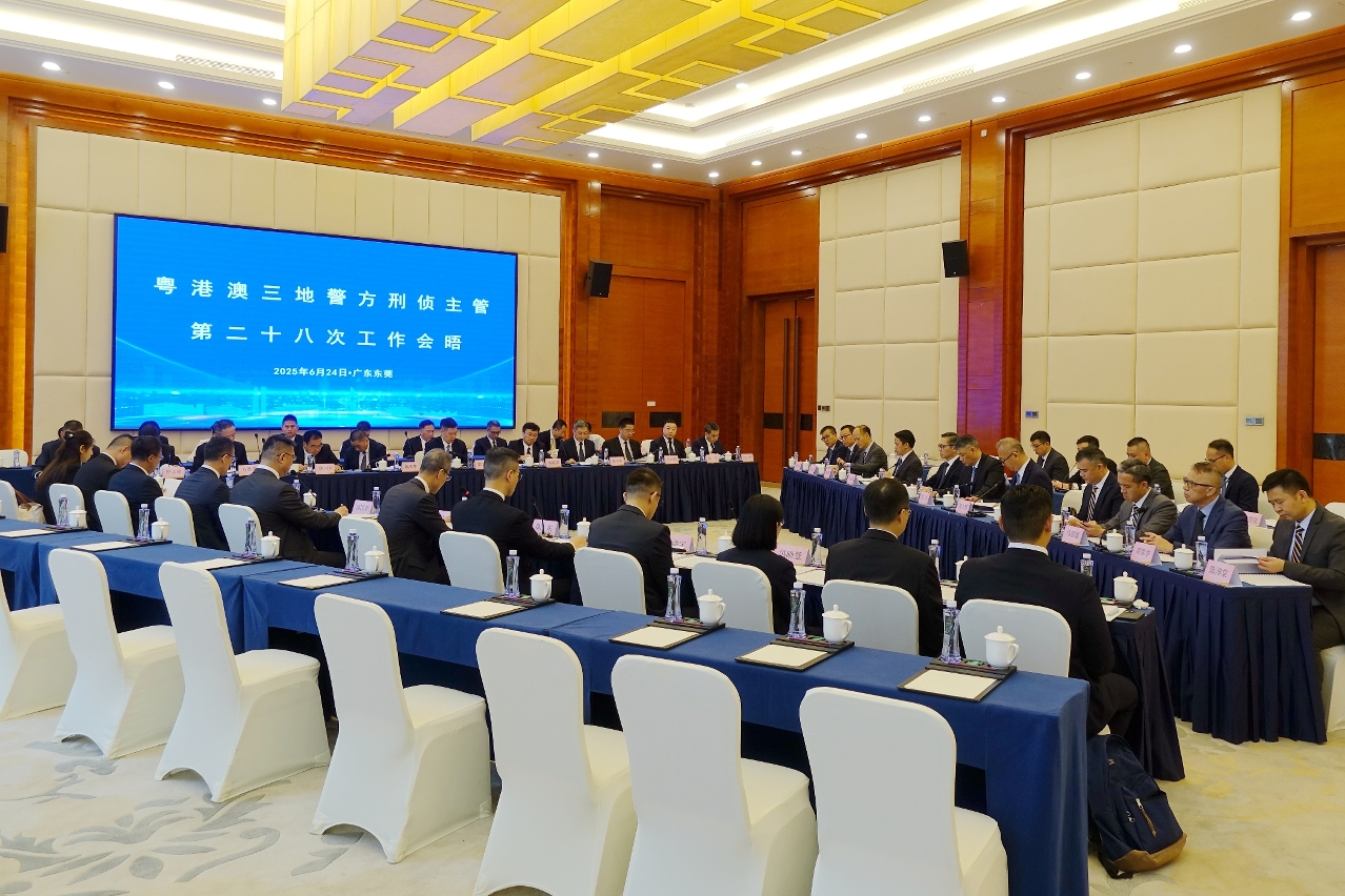 Realizou-se no dia 24 de Junho, em Dongguan, na província de Guangdong, o “28.º Encontro de Trabalho entre Responsáveis das Polícias de Investigação Criminal de Guangdong, Hong Kong e Macau”. As delegações policiais das três regiões foram chefiadas pelos senhores Comandante-geral dos Serviços de Polícia Unitários (SPU) de Macau, Leong Man Cheong, Subdirector da Directoria Provincial de Segurança Pública de Guangdong, Liang Ruiguo, e Segundo-comandante da Polícia de Hong Kong, Yip Wan-lung. O Subchefe da Divisão dos Serviços de Ligação para os Assuntos Policiais do Gabinete de Ligação do Governo Popular Central na Região Administrativa Especial de Hong Kong, Xu Hua e o Subchefe da Divisão dos Serviços de Ligação para os Assuntos Policiais do Gabinete de Ligação do Governo Central na Região Administrativa Especial de Macau, Xu Yongchang, foram especialmente convidados a participar na reunião.
