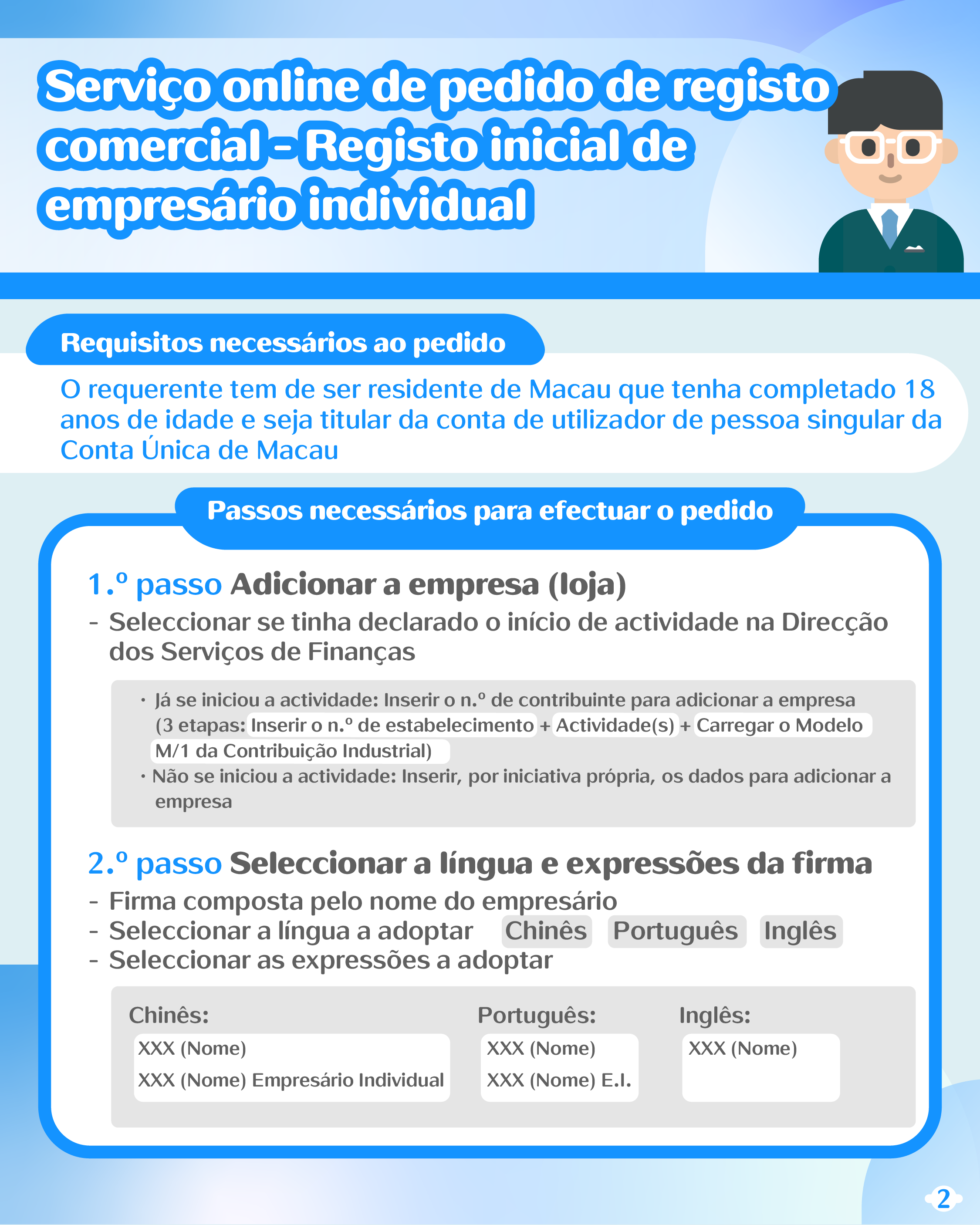 Relativamente ao registo comercial, são lançados novos serviços totalmente electrónicos do registo inicial de empresário comercial, pessoa singular, da alteração do domicílio (endereço) de empresário comercial, pessoa singular e do cancelamento do registo de empresário comercial, pessoa singular. Para tal, os cidadãos podem apresentar os pedidos, efectuar o pagamento dos encargos e levantar a cópia do registo através da Plataforma para Empresas e Associações, contribuindo assim para a concretização do novo modelo do tratamento de assuntos por via online.