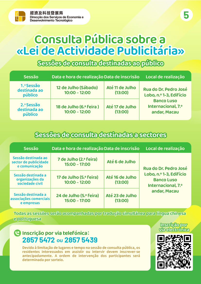 Além disso, a DSEDT realizará 5 sessões de consulta durante o período de consulta (vide os detalhes na infografia). Os interessados em participar podem obter mais informações ou proceder à inscrição na página web temática ou digitalizar o código QR ou ligar 2857 5472/2857 5439 durante o horário de expediente.