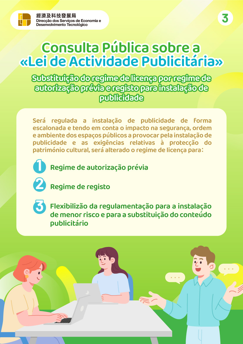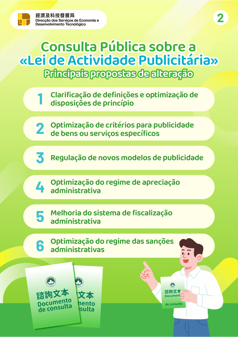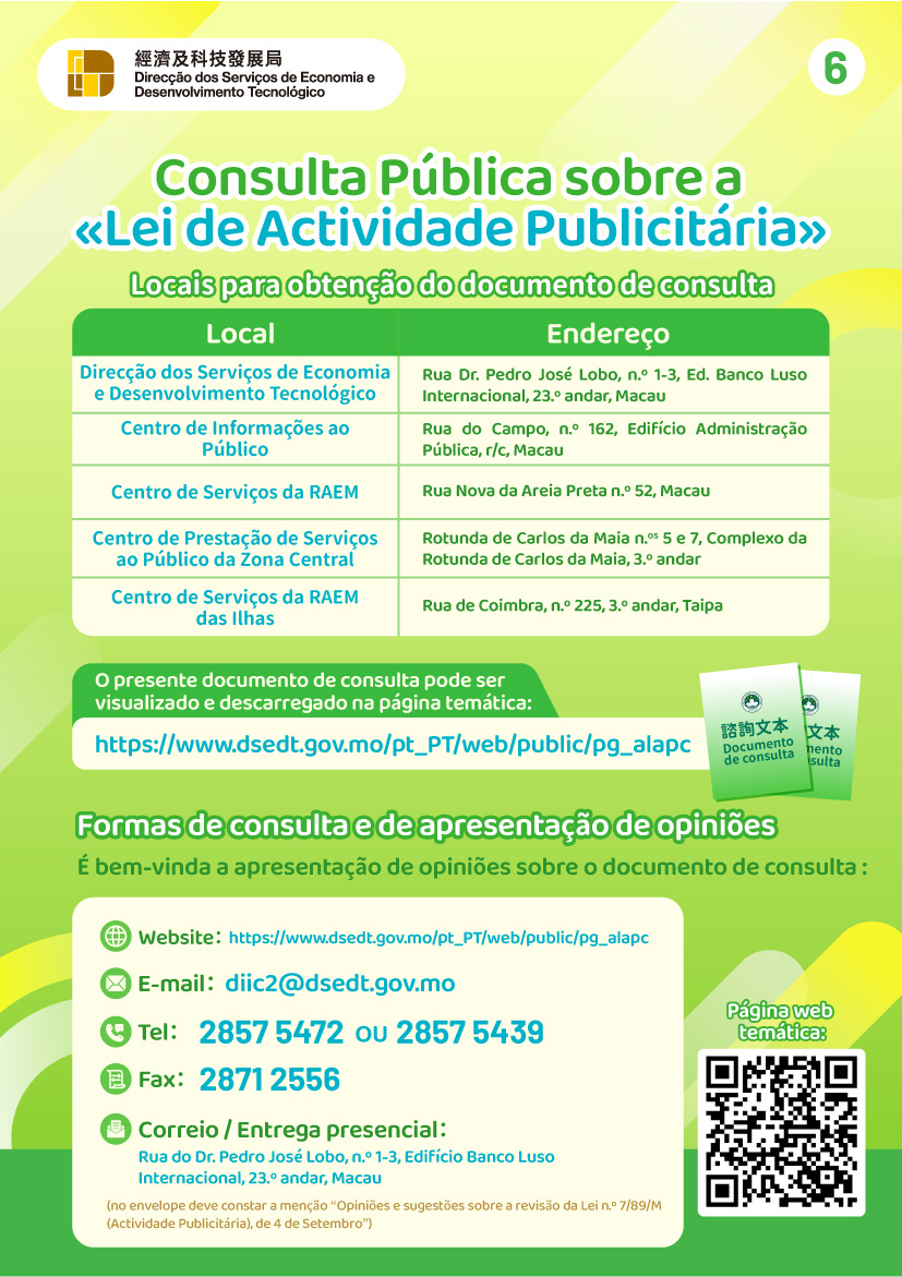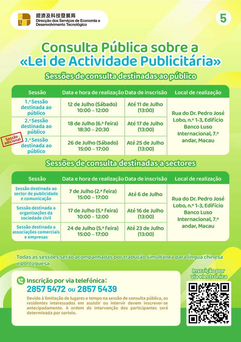 Além disso, para melhor recolher as opiniões dos diversos sectores sociais sobre a revisão da “Lei da actividade publicitária”, a DSEDT realizará mais uma sessão de consulta destinada ao público, no dia 26 de Julho (sábado), das 15h00 às 17h00, os residentes podem proceder à inscrição através da página temática, da leitura do código QR na infografia ou dos números de telefone 28575472 ou 28575439 durante o horário de expediente.