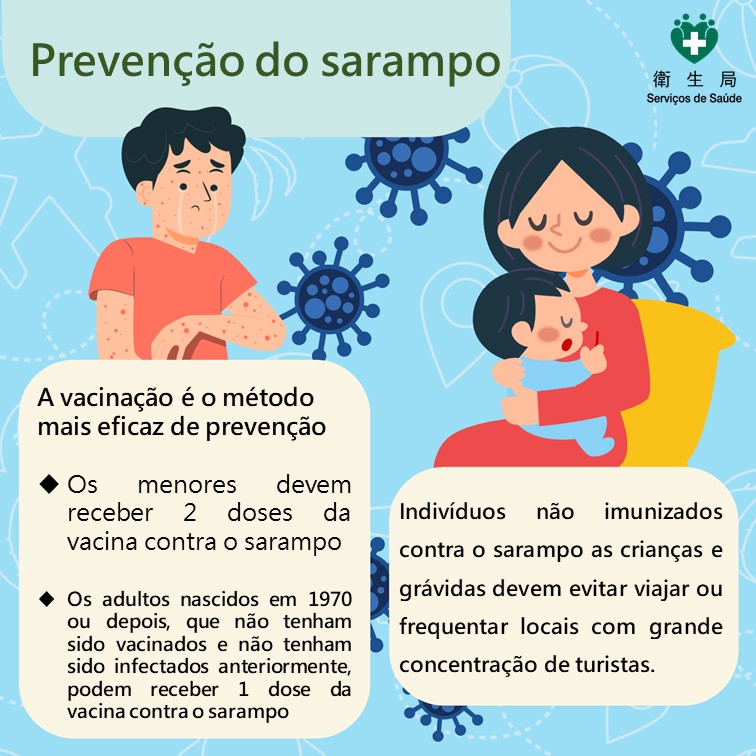 Os residentes devem prestar atenção à situação recente no destino, por exemplo, se estão a ocorrer surtos de doenças ou potenciais riscos que afectem a saúde, devem tomar as precauções necessárias. Considerando que os casos de sarampo têm vindo a aumentar em diferentes graus, em muitas partes do mundo, os Serviços de Saúde apelam aos residentes para, antes de viajarem, completarem a vacinação contra o sarampo. Uma vez que a vacinação é o método mais eficaz para prevenir a infecção pelo sarampo, os menores devem tomar pelo menos duas (2) doses da vacina contra o sarampo depois de completarem um (1) ano de idade para ficarem totalmente imunizados. Os adultos nascidos depois de 1970 que não tenham sido infectados com sarampo e que não tenham sido vacinados contra o sarampo depois de completarem um (1) ano de idade, devem receber uma (1) dose de vacina.