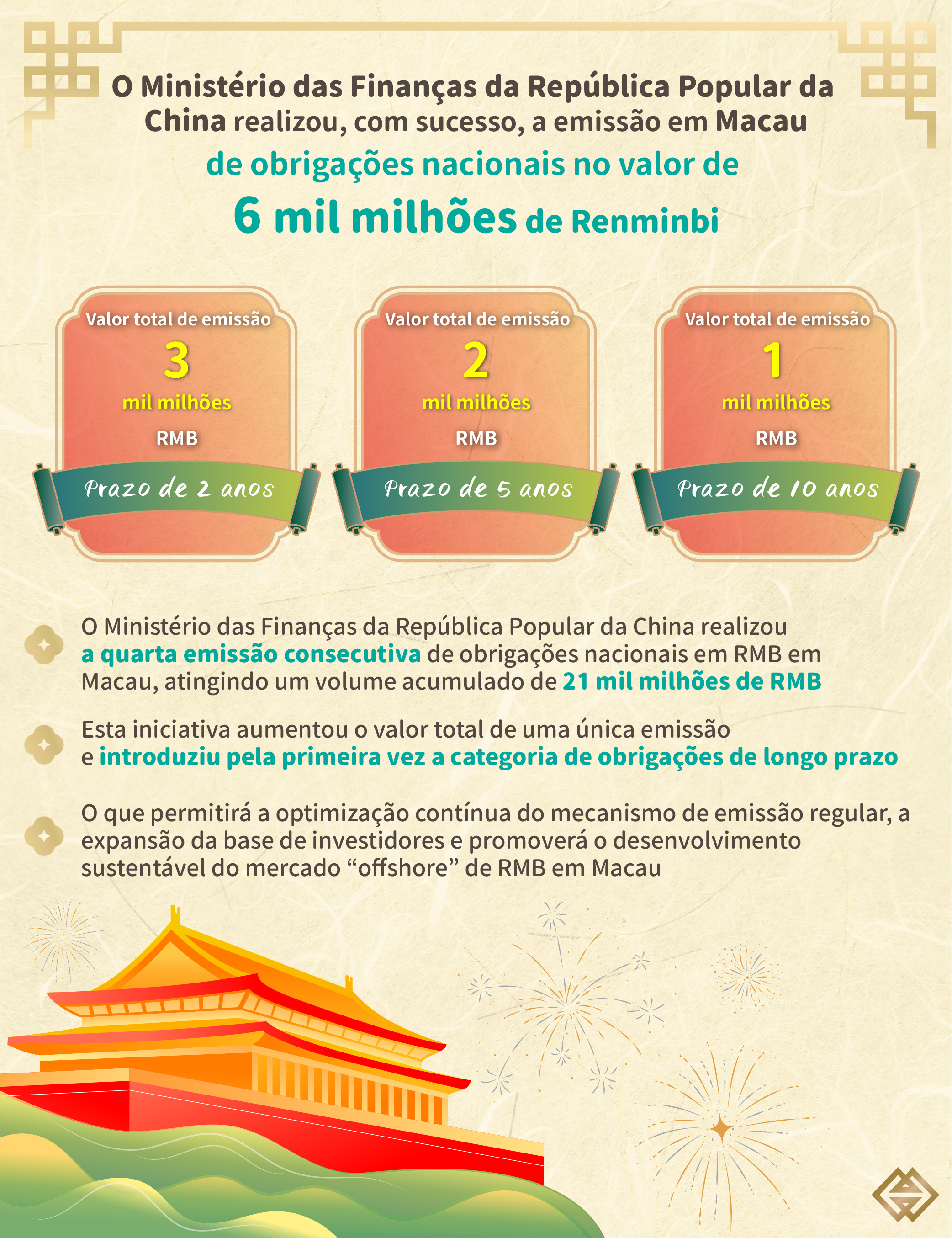 O Ministério das Finanças da República Popular da China realizou, hoje (dia 16), com sucesso, a emissão de obrigações nacionais em Renminbi (RMB) na Região Administrativa Especial de Macau. Por sua vez, a Autoridade Monetária de Macau felicita o sucesso da presente emissão, manifestando o seu agradecimento pelo apoio contínuo do Ministério das Finanças ao desenvolvimento do mercado obrigacionista de Macau. Esta emissão, destinada a investidores profissionais, envolveu um valor total de 6 mil milhões de RMB. Entre estas, 3 mil milhões de RMB de obrigações foram emitidas com prazo de dois anos, a uma taxa de juro de 1,43%; 2 mil milhões de RMB de obrigações foram emitidas com prazo de cinco anos, a uma taxa de juro de 1,55%, enquanto 1 mil milhões de RMB de obrigações foram emitidas com prazo de dez anos, a uma taxa de juro de 1,72%. A presente emissão foi bem acolhida pelo mercado, tendo registado uma subscrição excessiva.