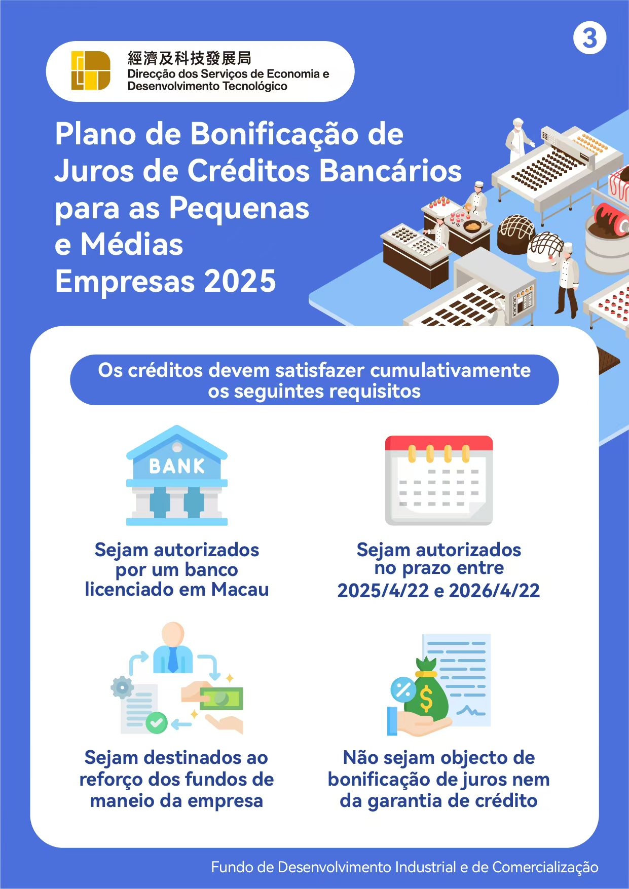 O Plano de Bonificação de Juros de Créditos Bancários para as Pequenas e Médias Empresas 2025 visa ajudar as pequenas e médias empresas a reforçar o fluxo de capitais, promover o desenvolvimento estável das empresas e aumentar a sua confiança na exploração dos negócios. As pequenas e médias empresas qualificadas podem requerer a bonificação de juros de créditos através dos bancos, desde que obtenham, no período entre 22 de Abril de 2025 e 22 de Abril de 2026, o crédito autorizado por um banco licenciado em Macau destinado a financiar as necessidades de fundo de maneio da empresa candidata. O montante máximo dos créditos a conceder a cada empresário comercial é de cinco milhões de patacas, com o prazo máximo de bonificação de três anos e o limite máximo da taxa anual de bonificação é de 4%.