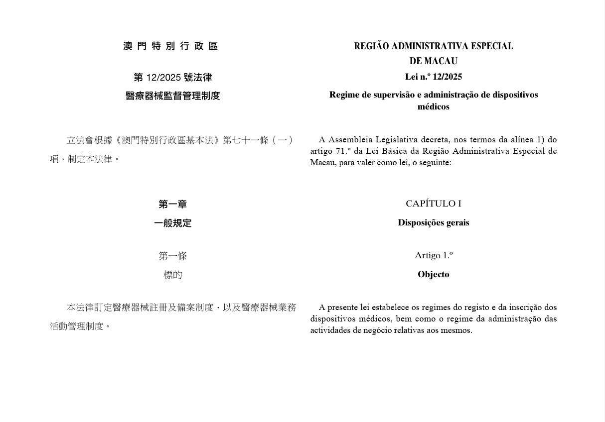 A proposta de lei intitulada “Regime de supervisão e administração de dispositivos médicos” foi aprovada pela Assembleia Legislativa no dia 14 de Julho de 2025 e publicada no Boletim Oficial da Região Administrativa Especial de Macau no dia 28 de Julho.