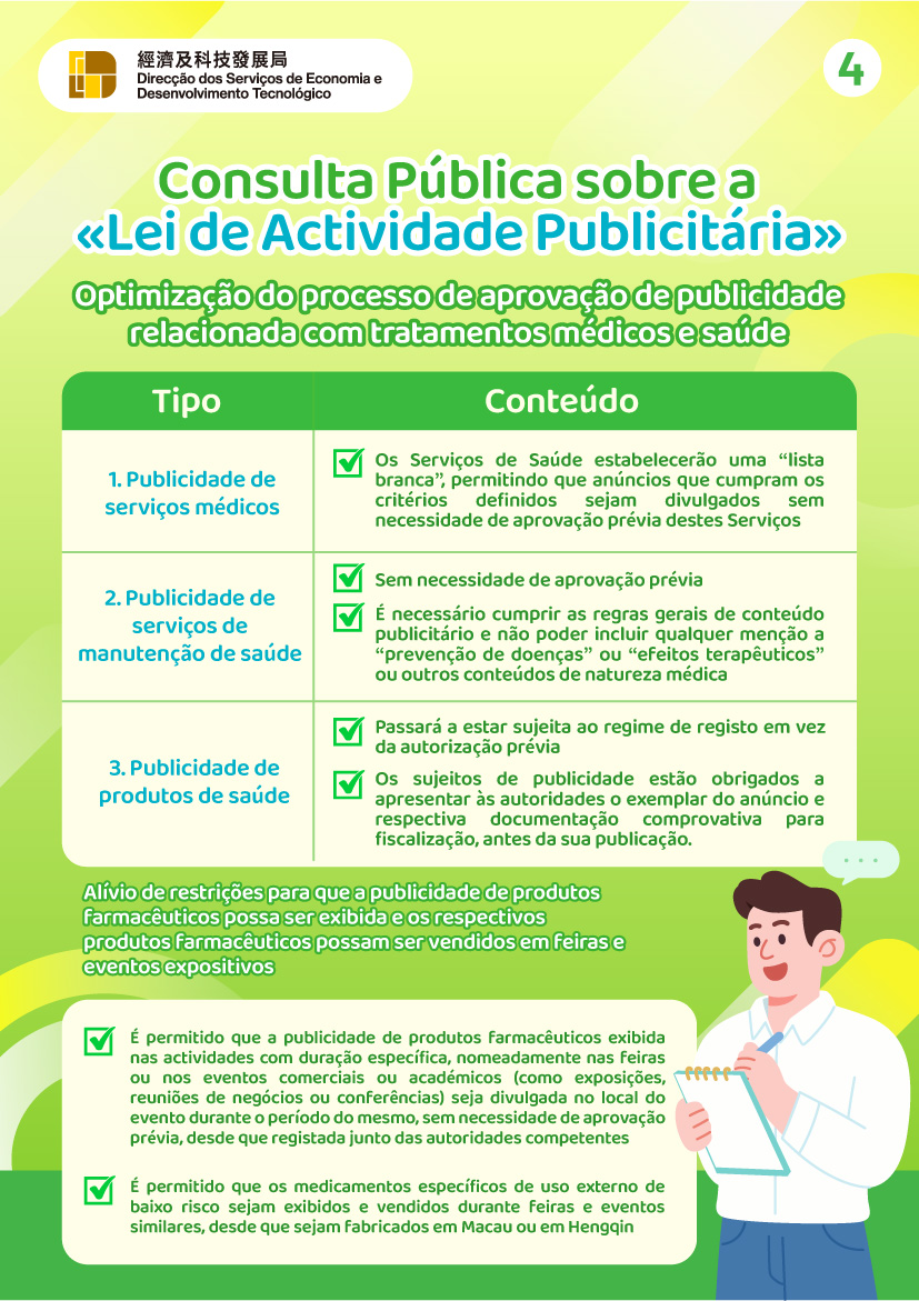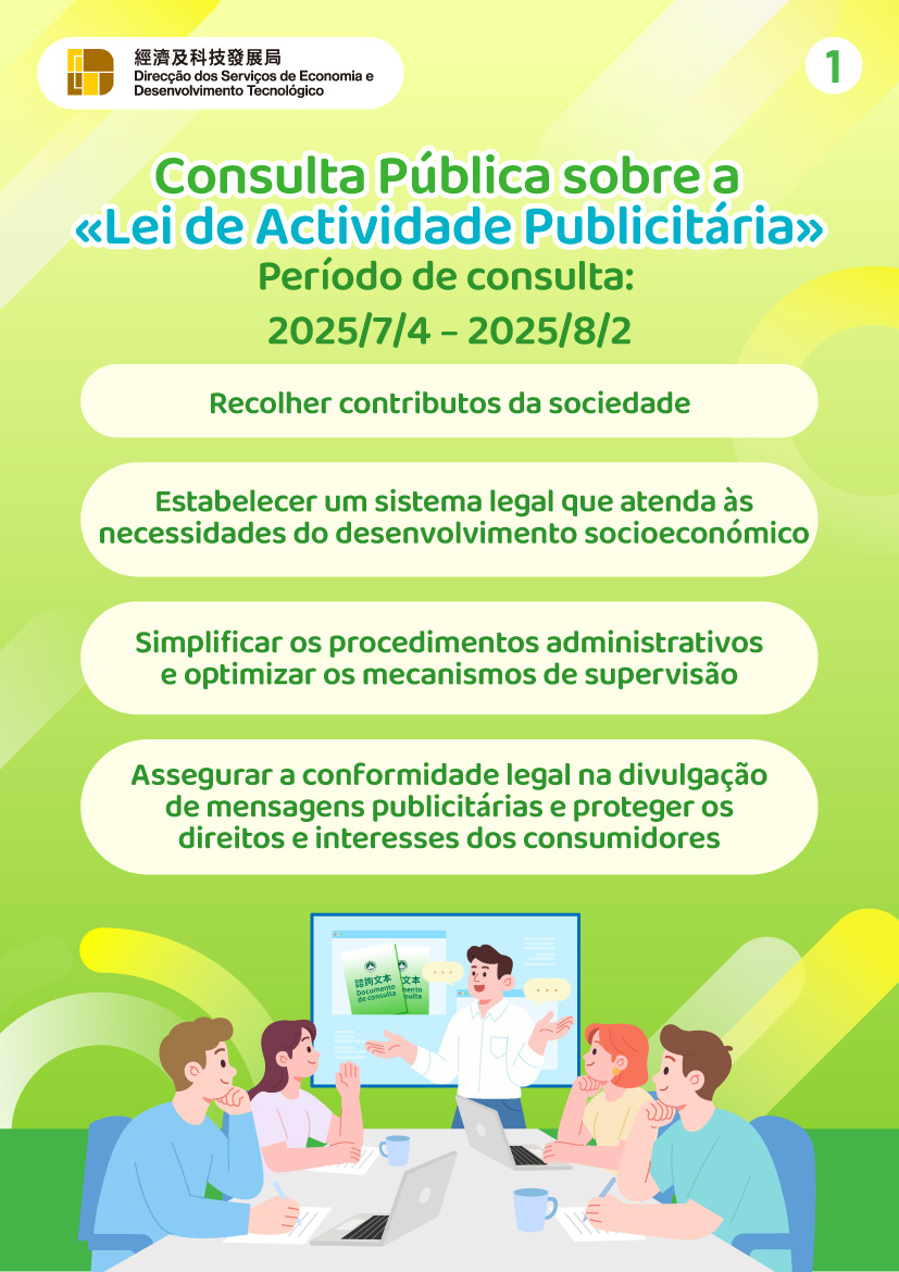 A Direcção dos Serviços de Economia e Desenvolvimento Tecnológico (DSEDT) realizou sessão de consulta destinada às associações comerciais e empresas (dia 24 de Julho), e a última sessão de consulta destinada ao público (dia 26 de Julho), ambas sobre a revisão da “Lei de Actividade Publicitária”, para auscultar as opiniões das associações comerciais, empresas e público sobre a revisão da lei.