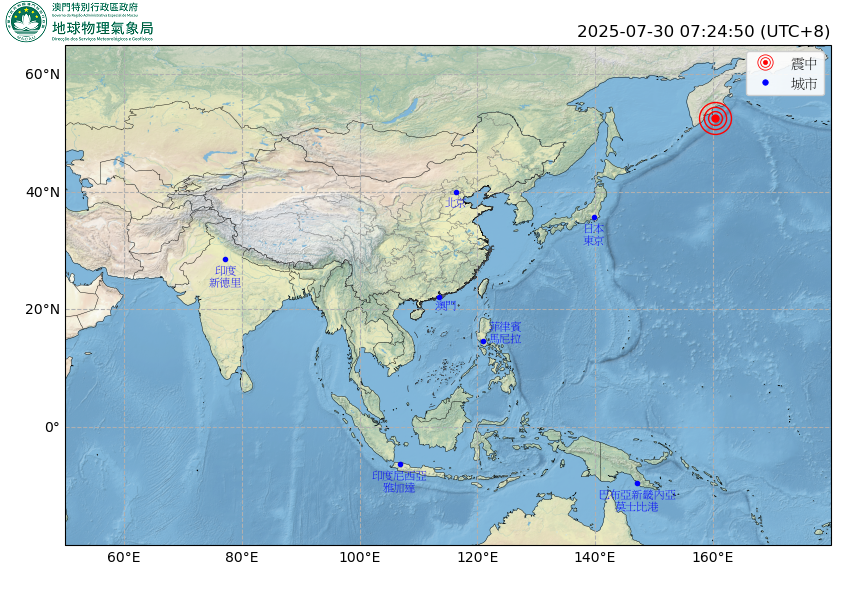 Às 7:24, hora de Macau, do dia 30 de Julho de 2025, ocorreu um forte sismo de pouca profundidade nas proximidades da costa leste da Península de Kamchatka. O epicentro do sismo localiza-se a 52,50° N e 160,40° E, a cerca de 5199 km a nordeste de Macau.