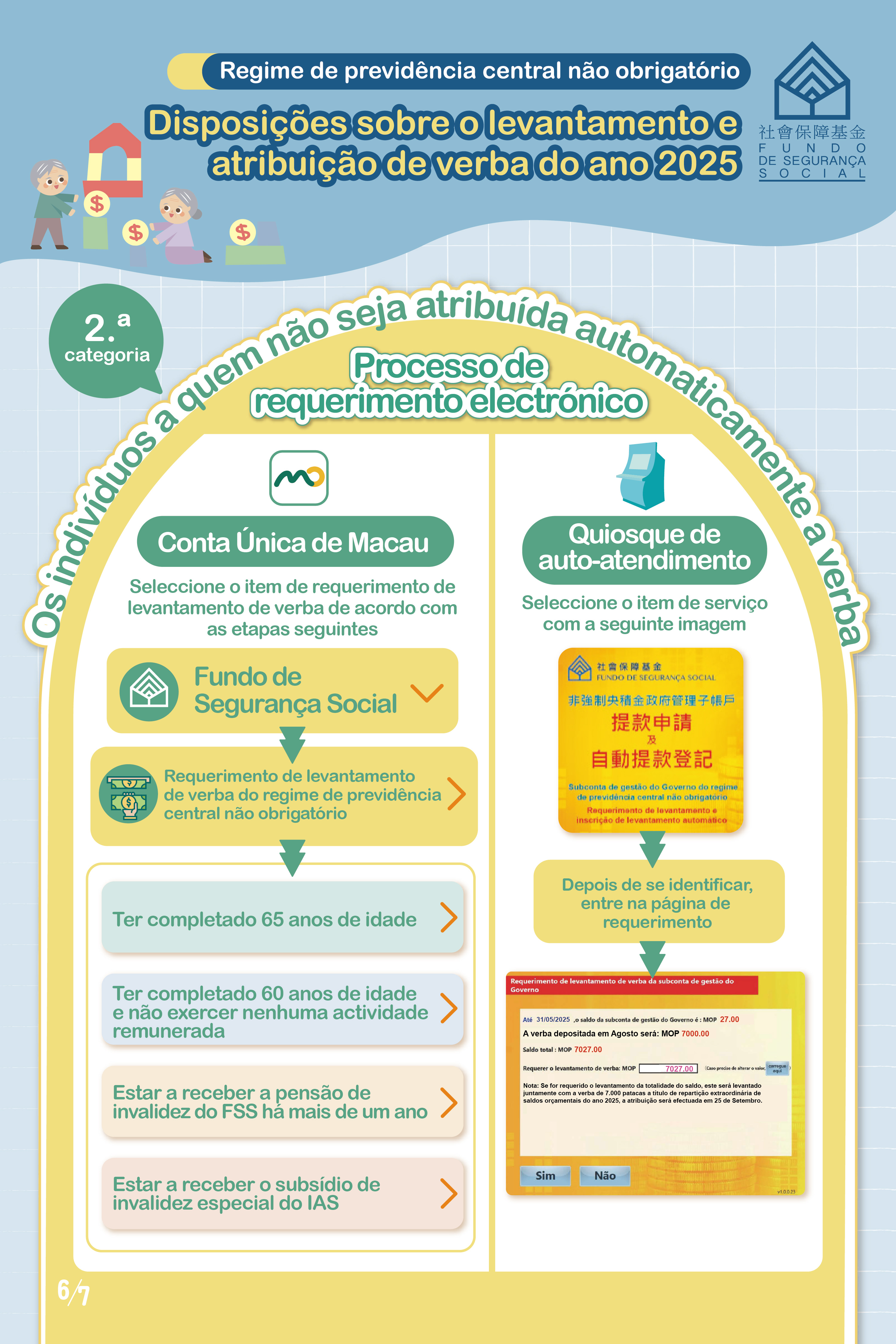 Quanto aos indivíduos com idade igual ou superior a 65 anos e que não tenham sido atribuídas automaticamente as verbas, aos indivíduos que não tenham completado 65 anos de idade e estejam a receber a pensão de invalidez do FSS há mais de um ano, ou aos indivíduos que estão a receber o subsídio de invalidez especial do Instituto de Acção Social, podem apresentar o requerimento de levantamento de verba junto do FSS. Se o requerimento for apresentado dentro de Agosto através da “Conta Única de Macau” ou dos quiosques de auto-atendimento, a verba será atribuída em 25 de Setembro. Enquanto aos indivíduos que efectuem o requerimento de levantamento de verba em suporte de papel dentro de Agosto ou aos indivíduos que apresentem requerimentos em Setembro, a verba será atribuída, o mais cedo, em 27 de Outubro. Nos últimos dias, o FSS tem enviado sucessivamente mensagens de aviso aos respectivos indivíduos (sem qualquer ligação). De acordo com a lei, cada pessoa só pode levantar as verbas uma vez por ano.