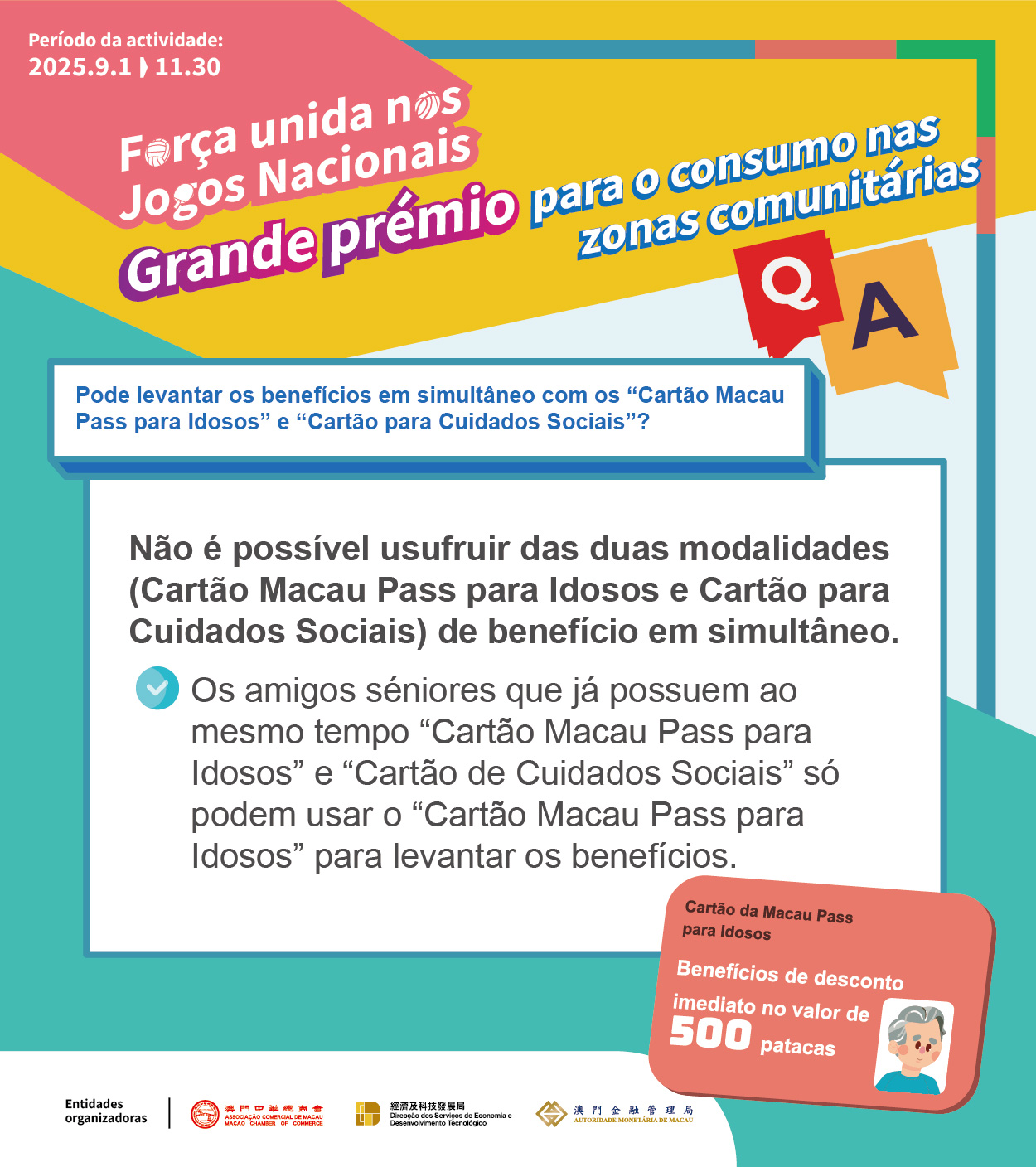 Para promover a recuperação sustentada e estável da economia de Macau e aumentar a confiança dos consumidores através do efeito dos Jogos Nacionais, o Governo da Região Administrativa Especial de Macau e a associação comercial coorganizam uma grande actividade promocional de consumo intitulada “Força dos Jogos Nacionais - Grande prémio para o consumo nas zonas comunitárias”, que decorrerá de 1 de Setembro a 30 de Novembro, com 13 semanas e serão atribuídos benefícios de consumo no valor de cerca de 500 milhões de patacas.