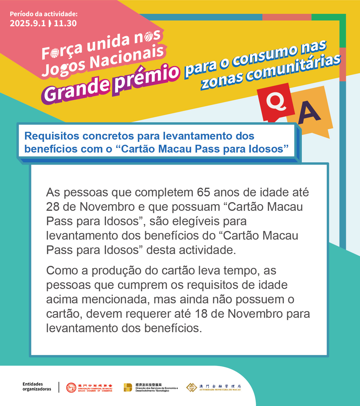 Para facilitar aos consumidores a identificação das lojas aderentes, as entidades organizadoras irão sucessivamente afixar cartazes e distribuir cartazes de mesa da actividade a mais de 20 mil lojas de Macau que aceitam a utilização dos benefícios. E ao mesmo tempo, a página exclusiva (https://www.macaospendingrewards.com/) e as linhas abertas(28575472 ou 28575439)para a actividade “Força dos Jogos Nacionais - Grande prémio para o consumo nas zonas comunitárias” já entraram em funcionamento, permitindo assim, a possibilidade do público em obter informações em qualquer altura.