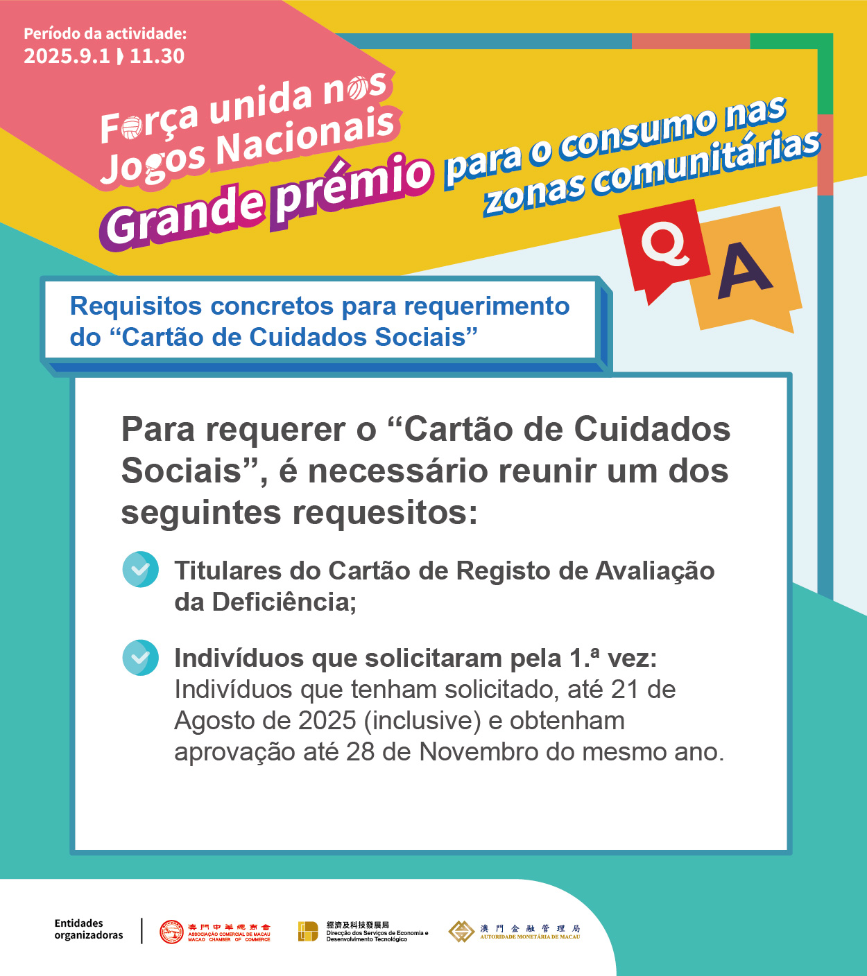Desde 23 de Agosto, o IAS já coordenou com mais de 40 instituições de serviços de reabilitação para notificar e ajudar os utilizadores elegíveis a requerer o “Cartão de Cuidados Sociais”. Os demais titulares de Cartão de Registo de Avaliação da Deficiência poderão levantar o Cartão de Cuidados Sociais a partir de 1 de Setembro nos 5 centros de acção social e no Centro de Avaliação Geral de Reabilitação do IAS.