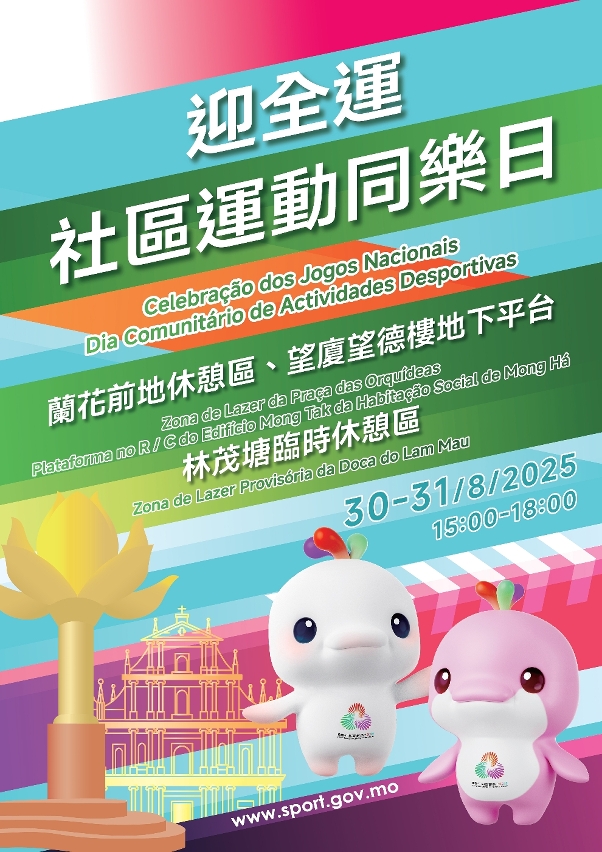 A fim de aprofundar o conhecimento da população sobre as modalidades da Zona de Competição de Macau da 15.ª edição dos Jogos Nacionais, da 12.ª edição dos Jogos Nacionais para Pessoas Portadoras de Deficiência e da 9.ª edição dos Jogos Olímpicos Especiais Nacionais (doravante designadas por “15.ª edição dos Jogos Nacionais e Jogos Olímpicos Especiais para Deficientes”), bem como promover o espírito de participação desportiva de toda a população, foi lançada a iniciativa “Celebração dos Jogos Nacionais x Dia Comunitário de Actividades Desportivas”. As actividades da última semana no âmbito desta iniciativa serão realizadas neste fim-de-semana, concretamente das 15h00 e às 18h00 dos dias 30 e 31 de Agosto, nos três seguintes locais: Zona de Lazer da Praça das Orquídeas, Plataforma no R/C do Edifício Mong Tak da Habitação Social de Mong Há e Zona de Lazer Provisória da Doca do Lam Mau. A iniciativa está aberta a todos os residentes interessados.