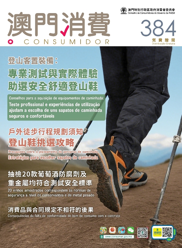 Os conselhos de consumidores de Guangdong, Macau e Guangzhou cooperaram-se para realizar o teste comparativo à segurança e à qualidade de sapatos de caminhada, tendo por referência as normas nacionais chinesas nesta matéria, tendo ainda efectuado uma avaliação às amostras em termos do nível de conforto, suporte e ajuste, através da experimentação das mesmas. Os dados do teste e o resultado da classificação encontram-se publicados nesta edição do “O Consumidor”, permitindo que os consumidores façam uma escolha de consumo mais inteligentes conforme as suas necessidades.