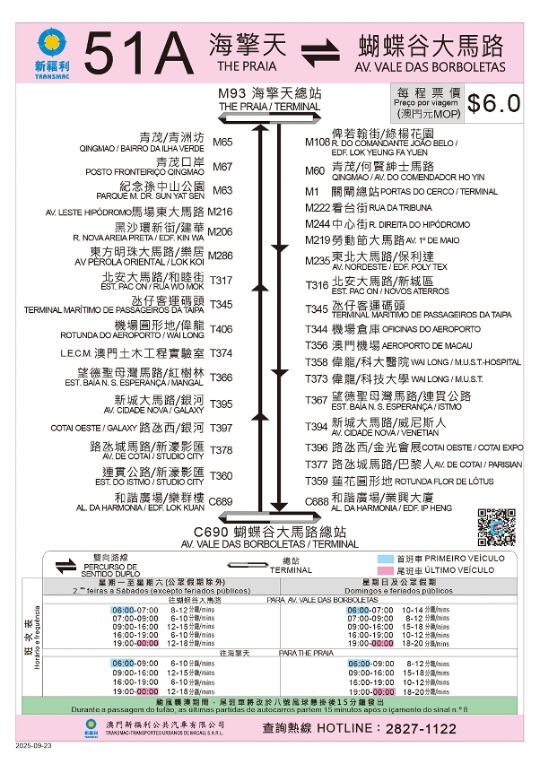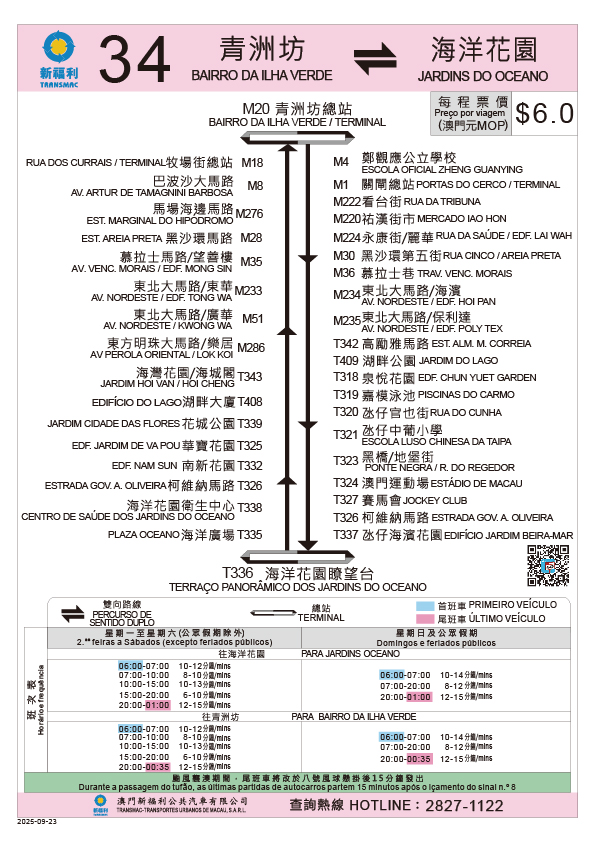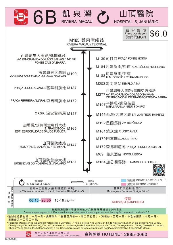 Adicionalmente, com a conclusão sucessiva das obras de Estação Elevatória de Águas Pluviais e Drenagem no Porto Interior e de optimização do respectivo local de paragem de autocarros, a partir de 23 de Setembro, a carreira n.º 6B retomará a paragem “RIVIERA MACAU/TERMINAL” como seu terminal de partida, e passará a fazer escala na paragem adicional “AV. PANORÂMICA DO LAGO SAI VAN/CENTRO MODAL DE TRANSPORTES DA BARRA”, cancelando simultaneamente a paragem na “ALM. SÉRGIO/RIVIERA MACAU”. Para coordenar com a conclusão das obras da zona de lazer à beira da Rua do Comandante João Belo, a carreira n.º H2 retomará, no mesmo dia, a fazer escala na paragem de desvio “RUA DE FAI CHI KEI/EDF. LOK YEUNG FA YUEN” próxima da nova estação de elevatória (em direcção à Rua Norte do Patane, a cerca de 60 metros da paragem inicial). Para ampliar ainda mais a cobertura de serviços, a carreira n.º 61 passará a fazer escala nas paragens “QINGMAO/BAIRRO DA ILHA VERDE”, “RUA DA DOCA SECA”, “PRAÇA DE PONTE E HORTA”, “ALM. SÉRGIO/MERCADO” e “ALM. SÉRGIO/TRAV. LIDO”, com detalhes disponíveis no guia de carreira.