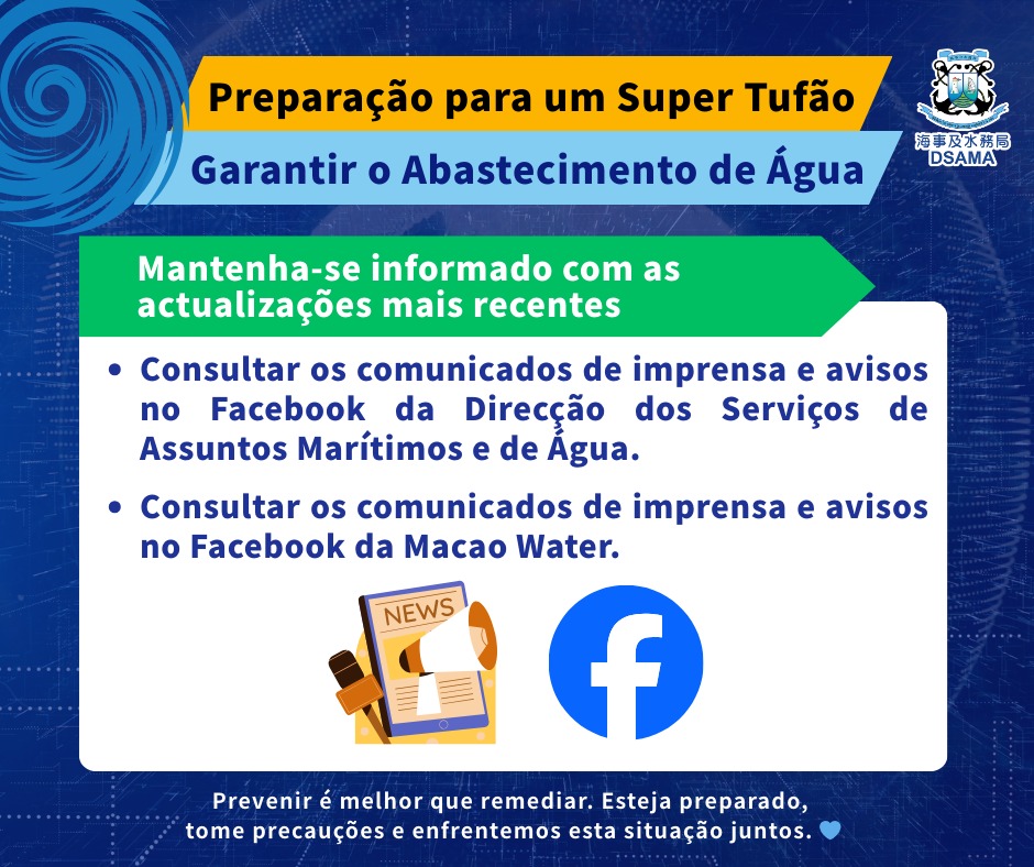 Devido à aproximação do super tufão, prevê-se um aumento na procura de água antes e depois da passagem do tufão em comparação com os dias normais, a Direcção dos Serviços de Assuntos Marítimos e de Água (DSAMA) coordenou com a Sociedade de Abastecimento de Águas de Macau (SAAM) na implementação prévia das medidas de protecção contra tufão e inundações, de modo a garantir a segurança e a estabilidade do abastecimento de água durante a passagem do tufão.