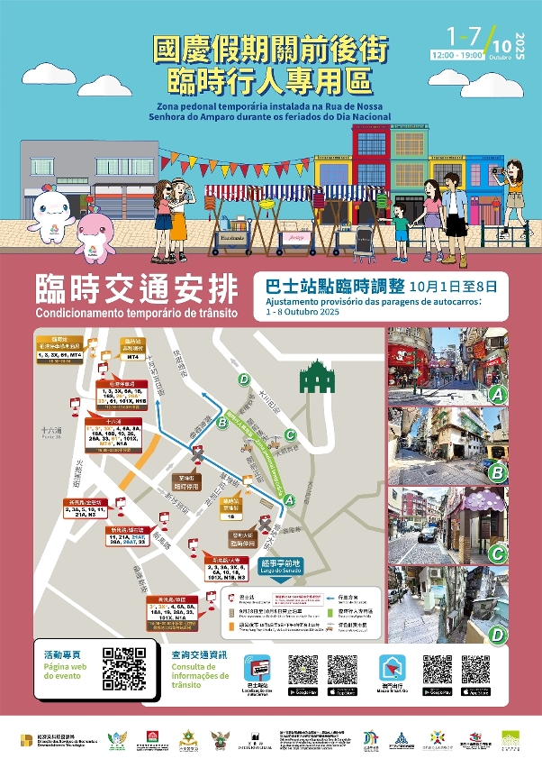 Para receber a época do maior numero de visitantes durante os feriados do Dia Nacional e optimizar a experiência de deslocação de residentes e turistas, o Governo da RAEM criará zonas pedonais temporárias no bairro antigo da Taipa e na Rua de Nossa Senhora do Amparo, entre 1 e 7 de Outubro, diariamente das 12h00 às 19h00, a fim de oferecer um ambiente de deslocação mais confortável e seguro ao bairro antigo da Taipa e às zonas circundantes das Ruínas de São Paulo.