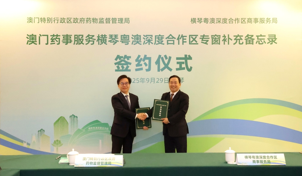 O Instituto para a Supervisão e Administração Farmacêutica (ISAF) e a Direcção dos Serviços de Assuntos Comerciais da Zona de Cooperação Aprofundada entre Guangdong e Macau em Hengqin assinaram, no dia 29 de Setembro de 2025, na Zona de Cooperação, o “Memorando Complementar sobre o Balcão Exclusivo dos Serviços para os Assuntos Farmacêuticos de Macau na Zona de Cooperação Aprofundada entre Guangdong e Macau em Hengqin”, para alargar o âmbito dos destinatários e do conteúdo de serviços do “balcão exclusivo dos serviços para os assuntos farmacêuticos de Macau na Zona de Cooperação Aprofundada entre Guangdong e Macau em Hengqin” (adiante designado por balcão exclusivo). O Presidente do ISAF, Choi Peng Cheong, o Vice-Presidente do ISAF, Ng Kuok Leong, e o Subdirector da Direcção dos Serviços de Assuntos Comerciais da Zona de Cooperação, Peng Jiuru, entre outros dirigentes, participaram na cerimónia de assinatura do memorando.