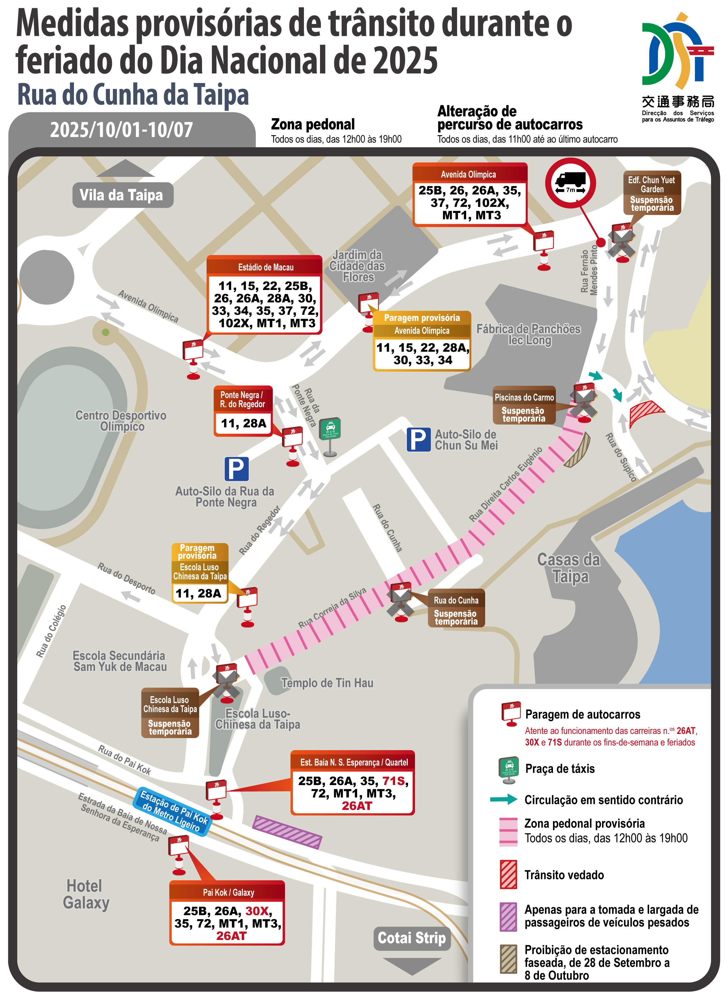 Nota: Para mais detalhes sobre a criação das zonas pedonais temporárias na Rua de Nossa Senhora do Amparo de Macau e na zona antiga da Taipa: https://www.dsat.gov.mo/dsat/news_detail.aspx?a_id=2C2E03DFA02CB3B00896A613EF0A992C