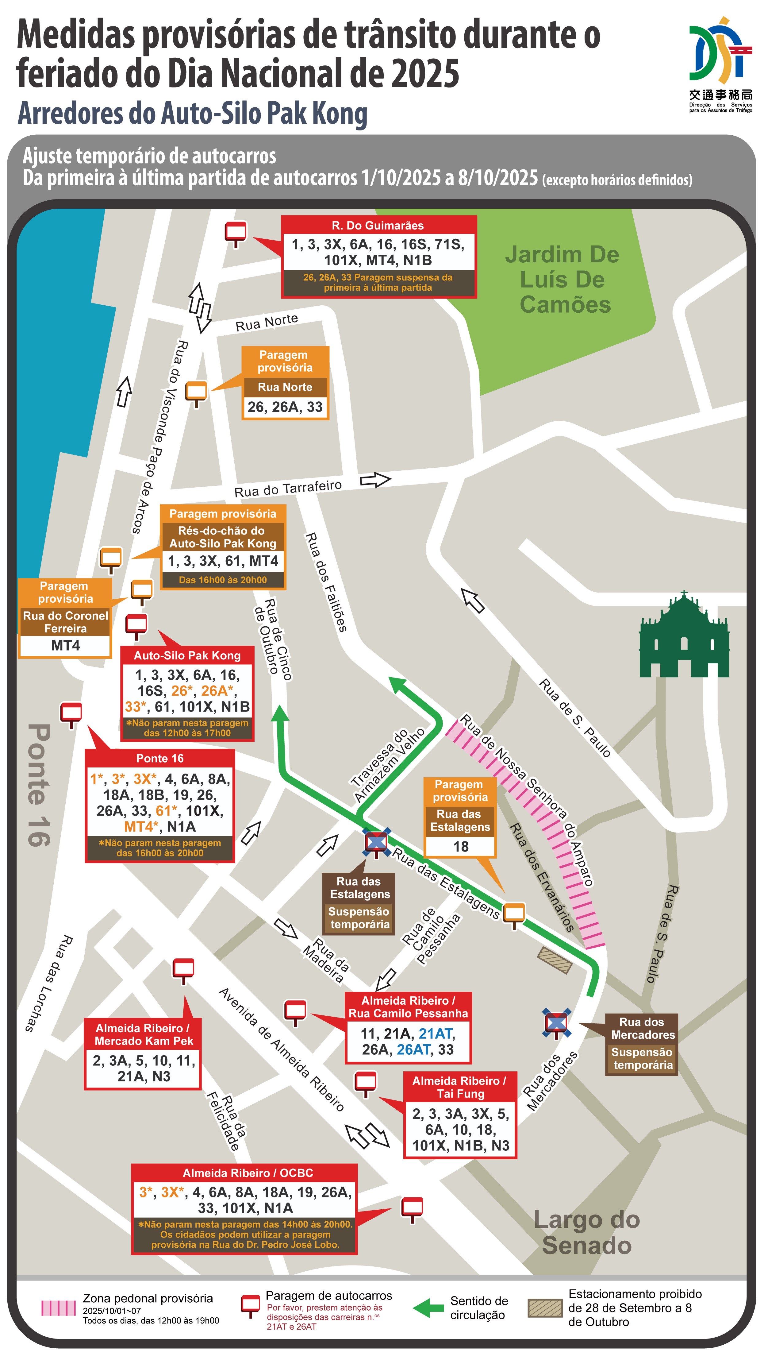 No que respeita ao serviço de autocarros, tendo em conta a experiência dos principais feriados anteriores e a realização de actividades festivas sazonais, a DSAT manterá as medidas temporárias de descongestionamento implementadas anteriormente nas áreas da Praça Leste das Portas do Cerco, Avenida de Almeida Ribeiro, Praia Grande, zonas adjacentes à Rua dos Mercadores, zona do Auto-Silo Pak Kong, e na zona antiga da Taipa. Para além disso, será também utilizada a área do piso térreo do Auto-Silo Pak Kong para a instalação de uma paragem provisória de desvio de autocarros, a qual, de 1 a 8 de Outubro, entre as 16h00 e as 20h00, permitirá desviar as carreiras n.os 1, 3, 3X, 61 e MT4 da paragem “Ponte 16”, optimizando a área de espera e a capacidade de circulação da zona. Por outro lado, a fim de racionalizar a situação da paragem “Praça Ferreira Amaral” e reforçar a capacidade de escoamento das vias circundantes, no mesmo período e horário, de 1 a 8 de Outubro, as carreiras n.os 39, 50, 50B, MT1, MT2 e MT5 deixarão de parar na paragem “Praça Ferreira Amaral” (via G), passando a parar na paragem do “Hotel Lisboa”. Paralelamente, em resposta ao fluxo de passageiros, as duas operadoras de autocarros irão aumentar a frequência das partidas e, durante o período de 1 a 8 de Outubro, irão explorar temporariamente as carreiras sazonais e especiais n.os 3BX, 17T, 21AT, 26AT e 101X carreira especial (101XS), reforçando a capacidade de transporte e acelerando o escoamento de passageiros. As vias rodoviárias circundantes estarão sujeitas a condicionamentos provisórios de trânsito, e os detalhes sobre os ajustamentos provisórios das carreiras de autocarros podem ser consultados nas tabelas em anexo ou nas páginas electrónicas da TCM (www.tcm.com.mo) e da Transmac (www.transmac.com.mo).