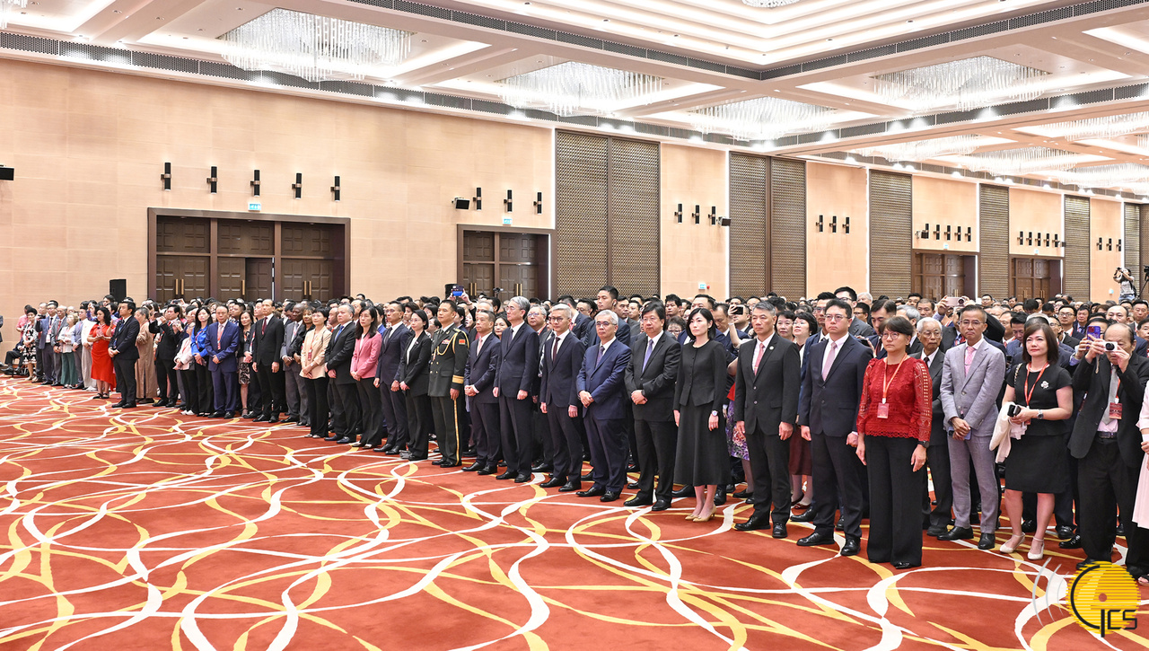 O Governo da Região Administrativa Especial de Macau (RAEM) realizou, esta manhã, às 09h30, no Complexo da Plataforma de Serviços para a Cooperação Comercial entre a China e os Países de Língua Portuguesa, a recepção em celebração do 76.º aniversário da Implantação da RPC. Entre os convidados, é de destacar a presença do vice-presidente da Conferência Consultiva Política do Povo Chinês, Edmund Ho, do director do Gabinete de Ligação do Governo Popular Central na RAEM, Zheng Xincong, do antigo Chefe do Executivo, Ho Iat Seng, do comissário do Ministério dos Negócios Estrangeiros na RAEM, Liu Xianfa, do comissário político da Guarnição em Macau do Exército de Libertação do Povo Chinês, Lin Qinghua, do presidente da Assembleia Legislativa, Kou Hoi In, e da presidente do Tribunal de Última Instância, Song Man Lei. O evento contou ainda com a presença dos membros do Conselho Executivo, de deputados da Assembleia Legislativa, de responsáveis dos serviços públicos, de representantes de Macau na Assembleia Popular Nacional e na Conferência Consultiva Política do Povo Chinês e de outras personalidades dos diversos quadrantes sociais, num total de cerca de 1320 convidados.