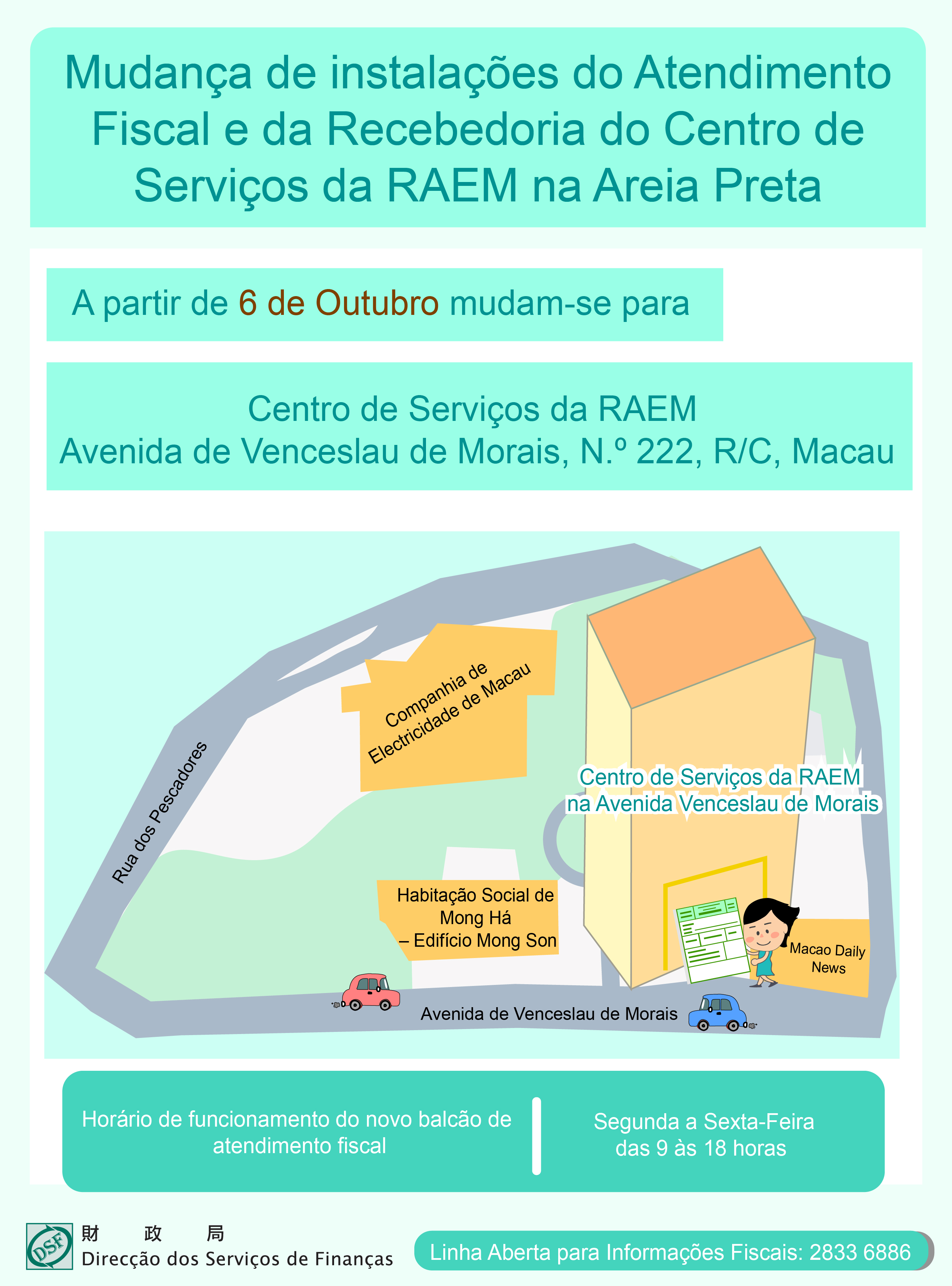 Os serviços da Direcção dos Serviços de Finanças, do Centro de Serviços da RAEM - Atendimento Fiscal e Recebedoria, sito na Rua Nova da Areia Preta, N.º 52, em Macau, têm como último dia de funcionamento, o dia 3 de Outubro de 2025, e passam a funcionar a partir de 6 de Outubro de 2025, no Centro de Serviços da RAEM, instalado na Avenida de Venceslau de Morais, N.º 222, R/C, em Macau, onde continua a prestação de serviços ao público.